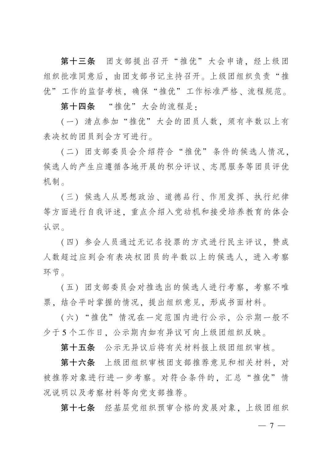 (六)“推优”情况在一定范围内进行公示,公示期一般不少于5个工作日,公示期内如有异议可向上级团组织反映。
