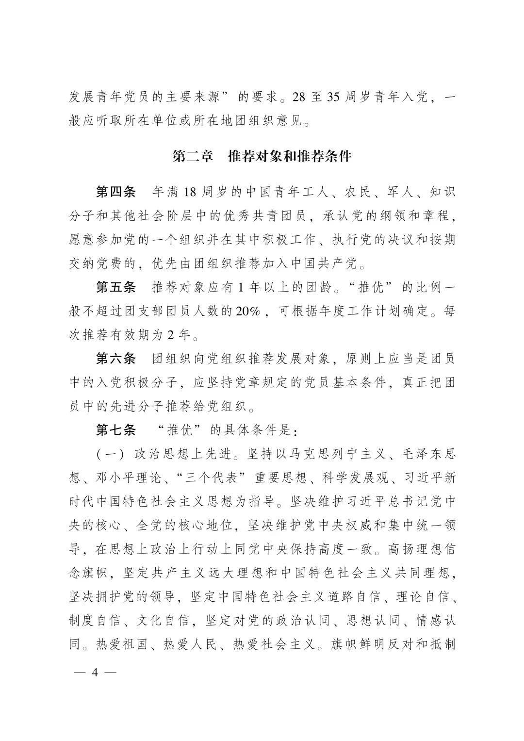 第四条 年满18周岁的中国青年工人、农民、军人、知识分子和其他社会阶层中的优秀共青团员,承认党的纲领和章程,愿意参加党的一个组织并在其中积极工作、执行党的决议和按期交纳党费的,优先由团组织推荐加入中国共产党。
