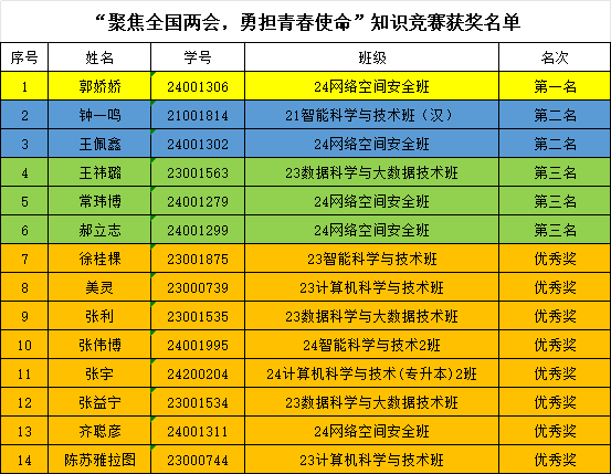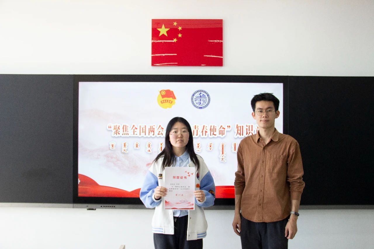 本次竞赛紧扣全国“两会”主题,围绕2025年全国两会热点展开,内容涵盖了全国“两会”的基本常识及政府报告、各国家机关显著成就与民生政策等核心议题,采用闭卷考试。我院团总支书记包巴雅力格、办公室副主任杨恒毅作为颁奖嘉宾为获奖同学颁奖。