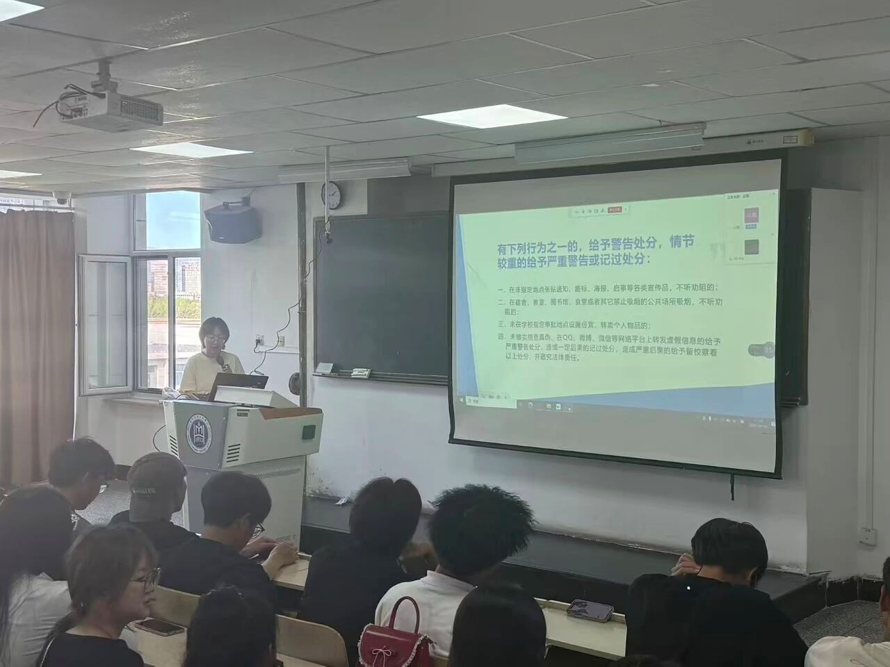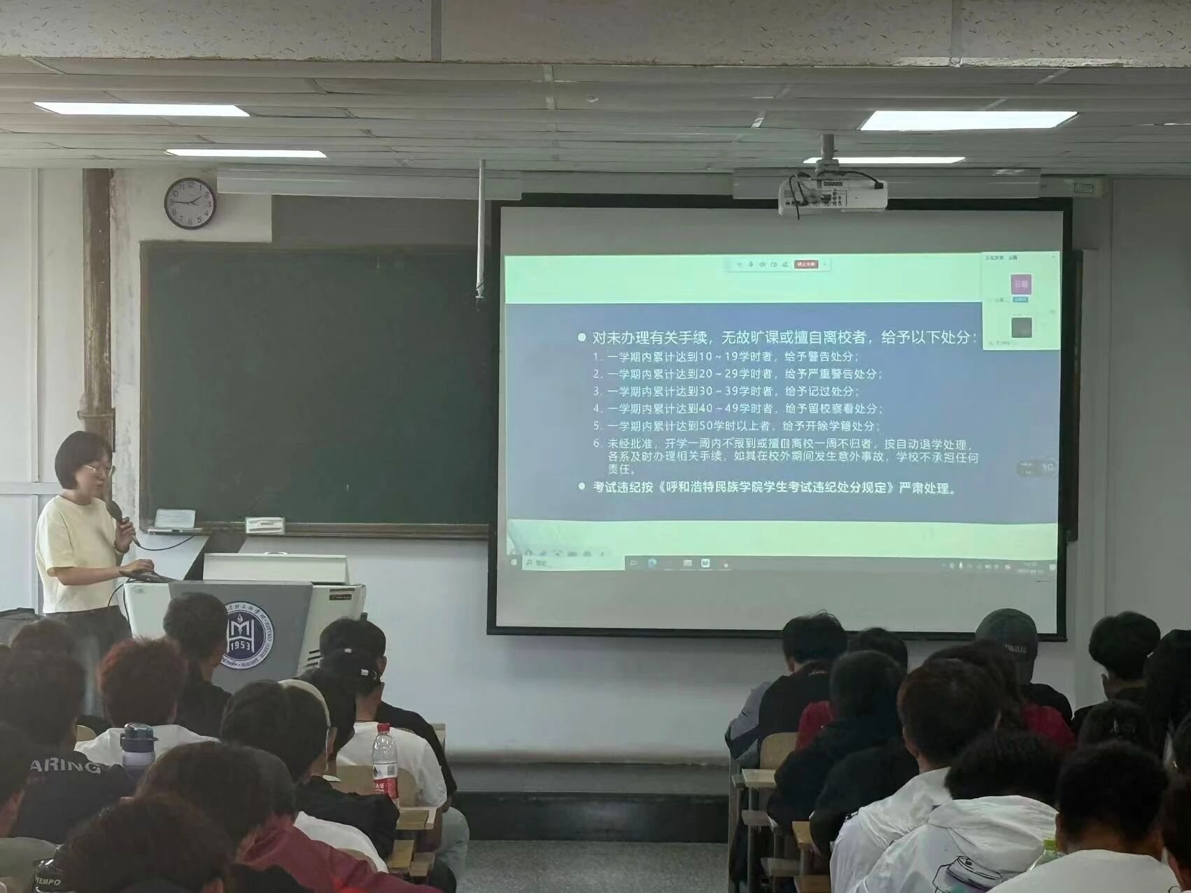 为帮助2025级新生尽快适应大学生活,树立规则意识与纪律观念,2025年9月16日下午,专职辅导员云磊为全体新生做学生违纪处分规定及综合测评办法解读专题讲座。