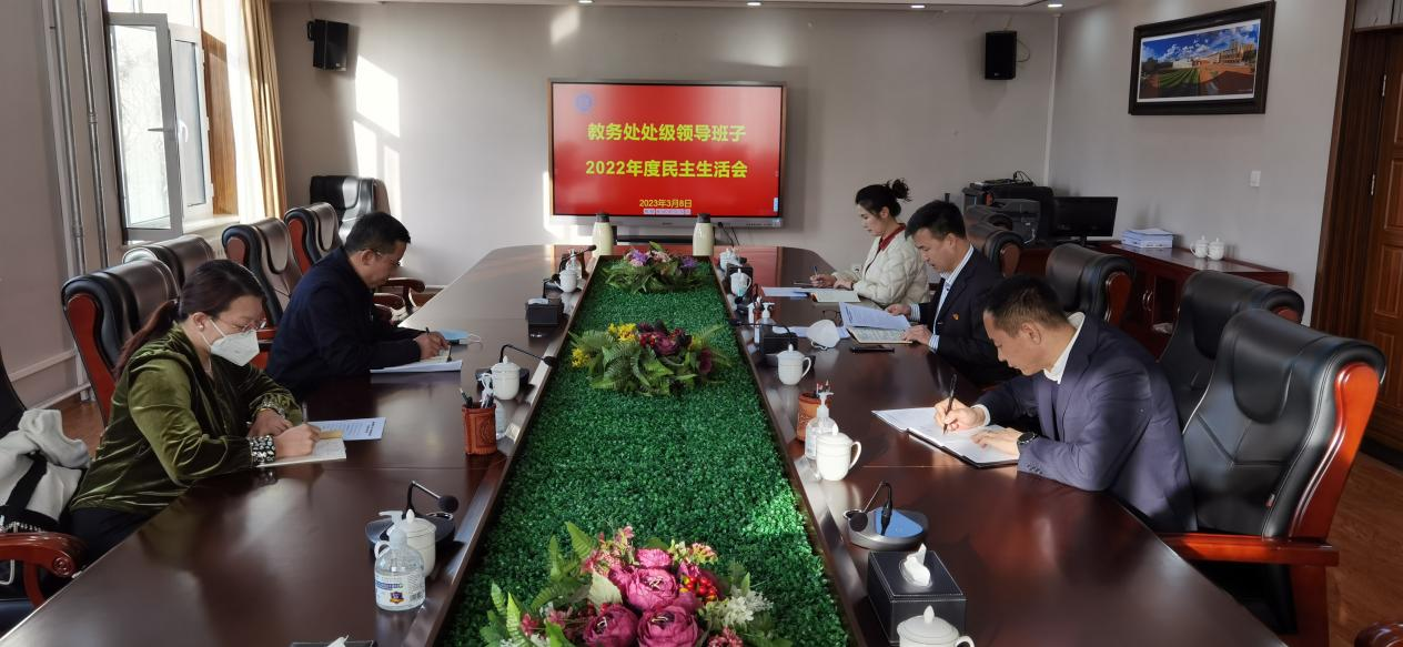 根据学校《关于召开 2022 年度全校处级党员领导干部民主生活会的预通知》要求,3月8日上午,教务处领导班子在办公楼3楼会议室召开2022年度民主生活会。校党委组织部副部长白秀和督导员兰兰同志到会指导。会议由教务处处长额尔敦布和主持,教务处领导班子成员哈斯额尔德尼、佟繁荣参加会议。
