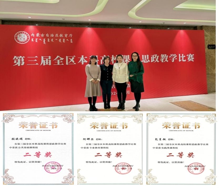 1月13日至14日,由内蒙古自治区教育厅主办的第三届全区本科高校课程思政教学比赛决赛落下帷幕。beat365官网4名参赛选手中共有3人挺进决赛,获得与其他高校选手同台竞技的机会。经过课堂教学设计、说课、教学展示三个环节,beat365官网阿娜尔老师荣获专业教育课程组二等奖,包呈敏老师荣获实践类课程组二等奖,张晓娟老师荣获公共基础课程组二等奖,实现了学校在该项赛事上的新突破。