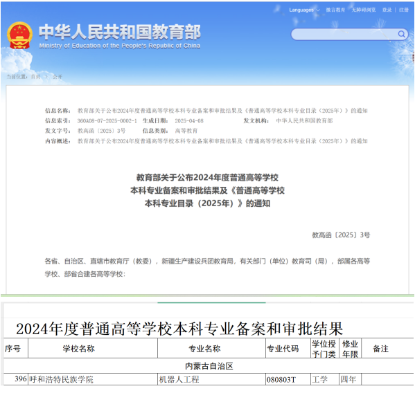 4月22日,教育部正式发布《关于公布2024年度普通高等学校本科专业备案和审批结果及〈普通高等学校本科专业目录(2025年)〉的通知》(教高函〔2025〕3号),beat365官网申报的“机器人工程”专业成功获批。