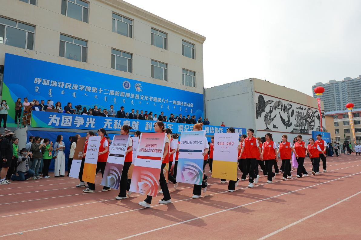 各学院代表队依次入场,师生身着节日盛装,逐一经过主席台接受检阅。大家精神抖擞、英姿勃发,展现了呼民院人朝气蓬勃、锐意进取、积极向上的精神风貌。