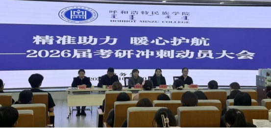 为进一步鼓舞考研学子士气,提供精准高效的备考支持,10月20日晚,学校在铸牢中华民族共同体意识教育馆思想政治教育实践教学基地举办“精准助力 暖心护航”2026届考研冲刺动员大会。会议由教务处副处长青格乐图主持,2026届考研班100余名学生参会。