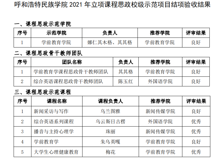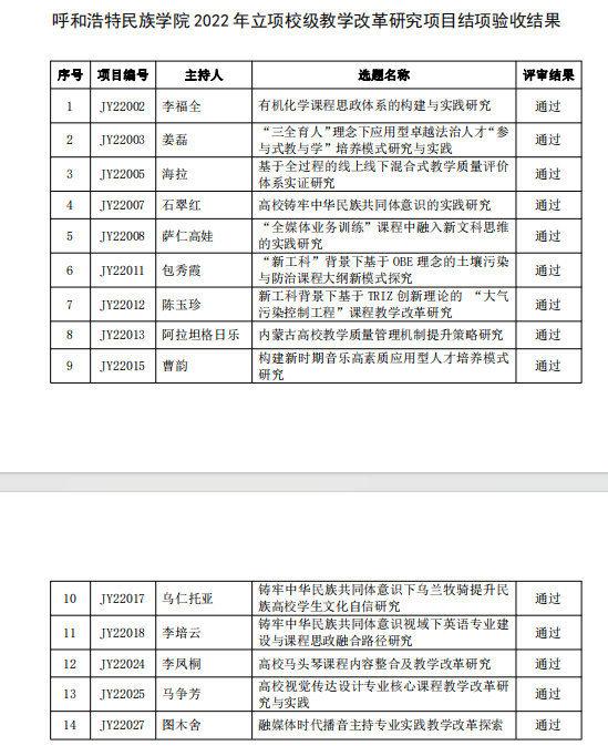 根据《关于开展beat365英国官方网站 2024 年课程思政示范建设项目结项及中期检查工作的通知》(呼和民院教务〔2024〕36 号)和《关于开展 2024 年度beat365英国官方网站教学改革研究项目申报立项与结项验收工作的通知》(呼和民院教务〔2024〕41 号),学校组织教学指导委员会开展了2021 年立项的课程思政校级示范项目、2022 年立项的校级教学改革研究项目结项验收工作。现对评审结果予以公布(名单详见附表)。
