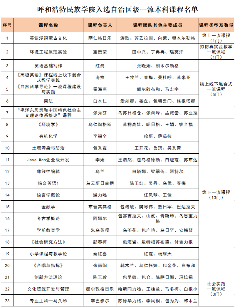 此次入选的23门课程中,包含线上一流课程1门、虚拟仿真实验教学一流课程1门、线上线下混合式一流课程5门、线下一流课程13门、社会实践一流课程3门。截至目前,学校共有37门课程入选自治区一流本科课程。