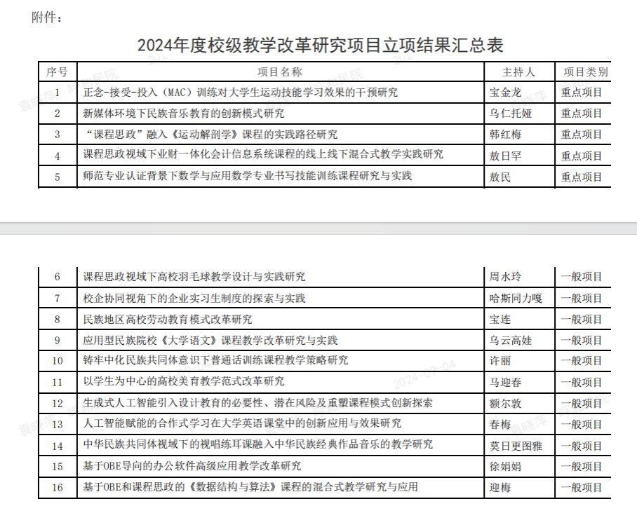 根据《关于开展2024年度beat365英国官方网站教学改革研究项目申报立项与结项验收工作的通知》(呼和民院教务〔2024〕41号)要求,经个人申报、学院(部门)推荐、教务处资格审核、学校教学指导委员会评审、公示无异议后遴选出“正念-接受-投入(MAC)训练对大学生运动技能学习效果的干预研究”等16个项目立项(具体名单见附件)为beat365英国官方网站2024年度校级教学改革项目,现对立项结果予以公布。