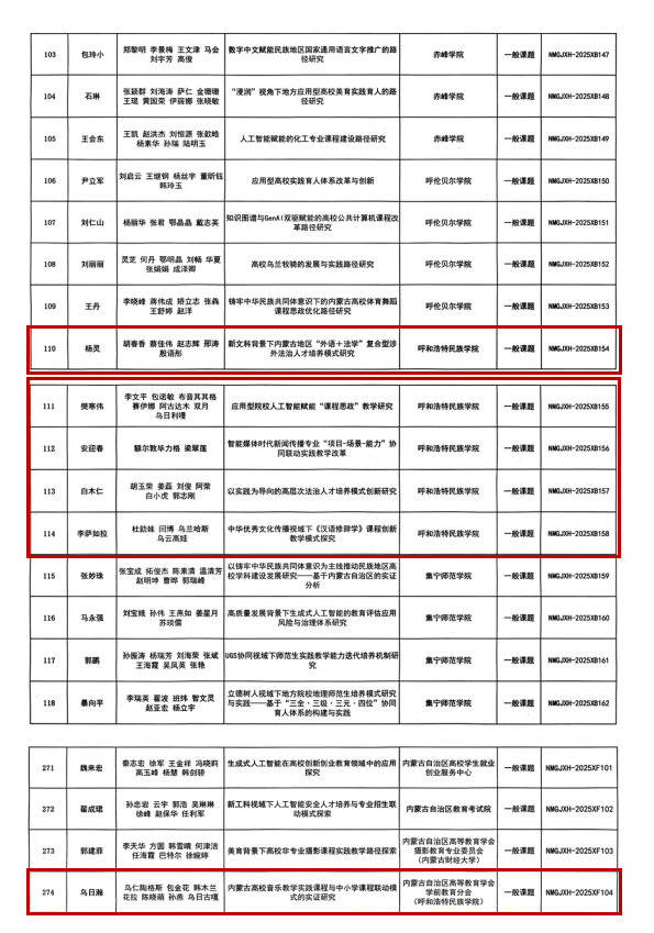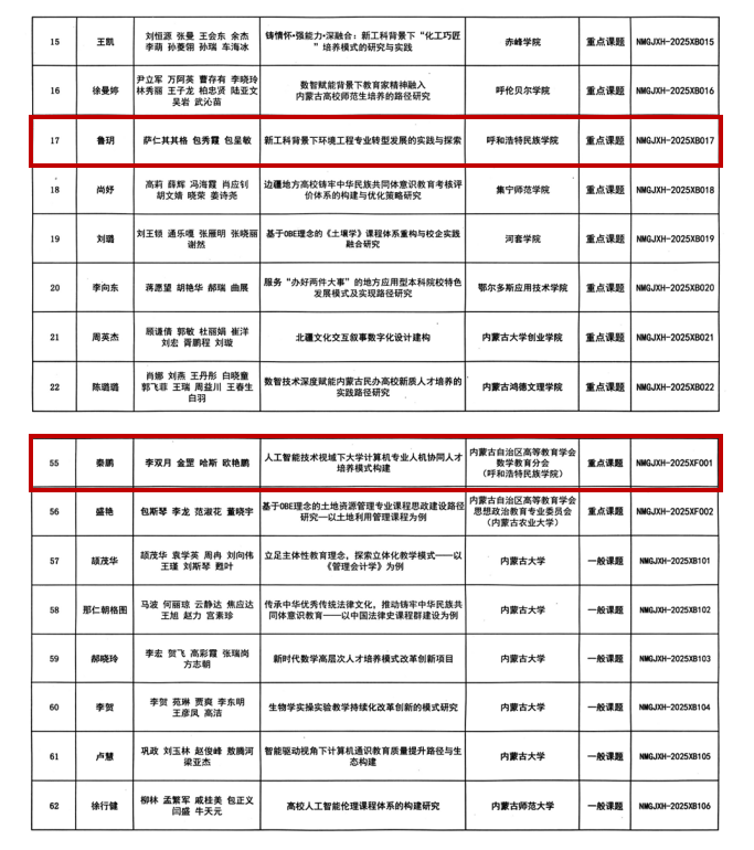 近日,内蒙古自治区高等教育学会公布的2025年度高等教育研究立项课题名单中,beat365官网推荐申报的10项课题中有8项课题成功获批立项,其中重点课题2项,一般课题6项。