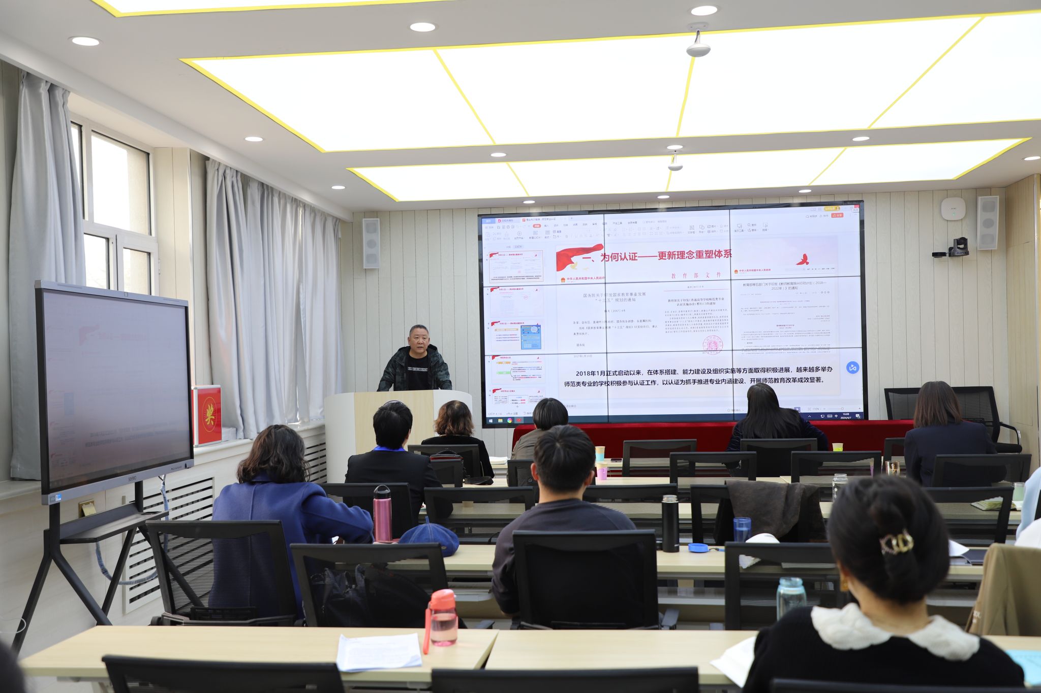 赵梅兰以《理念先行精准对标,做好师范专业认证工作》为主题,从“为何认证”“认证什么”“如何认证”“如何做好”四个方面做一次系统地阐释并结合学院目前的工作做推进师范专业认证工作的部署。首先围绕师范类认证的专业体系,从认证的目的、核心、理念出发,对体系内的每一条目录该如何去进行工作都进行了详细的介绍;其次要求老师们尤其是承担专业课程教学的老师们及时修订课程教学大纲,对照师范专业认证的基本要求做好课程目标达成度分析工作。此外,她还就本学期期末试卷的规范评阅、本科生毕业论文指导等专业认证材料的自评自建和专业见习、实习、研习等工作做了部署。学院全体人员各司其职,完成材料建设并进行规范存档以迎接专家进校评估。最后,教师发展与教学评估中心主任胡毕斯哈拉图分别从课程体系如何支撑毕业要求、课程教学如何挂钩课程目标、课程评价如何聚焦目标达成等三个维度解读了专业认证,为老师们提供了指引和方向。