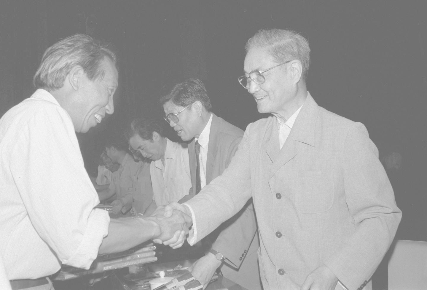 1991年6月26日,中共中央组织部、中共中央宣传部等单位在北京召开大会,表彰全国高校优秀思想政治工作者。这是宋平同志(右)向获奖的个人颁奖。新华社记者 张燕辉 摄