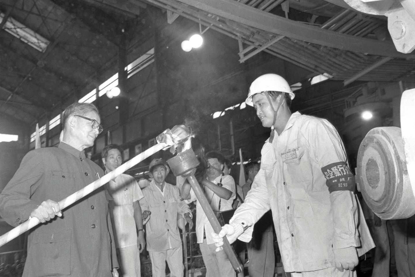 1985年9月15日,我国第一座日产万吨铁的高炉——宝钢一号高炉点火试生产。这是宋平同志(左一)为高炉点火。新华社记者 张平 摄