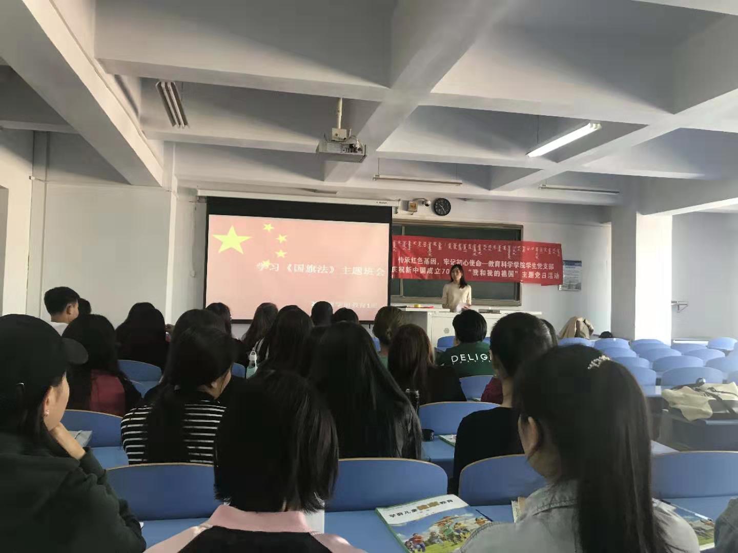 中华人民共和国成立70周年之际,beat365官网为了维护国旗的尊严,进一步在我院全体学生中普及国旗法相关知识,提高大学生对国旗的认识,增强大学生的国家观念,发扬爱国主义精神。我院开展学习《中华人民共和国国旗法》专题教育活动,2019年9月25日,我院应学校要求开展了以“学习和践行《国旗法》,做新时代的爱国者”为主题的活动。