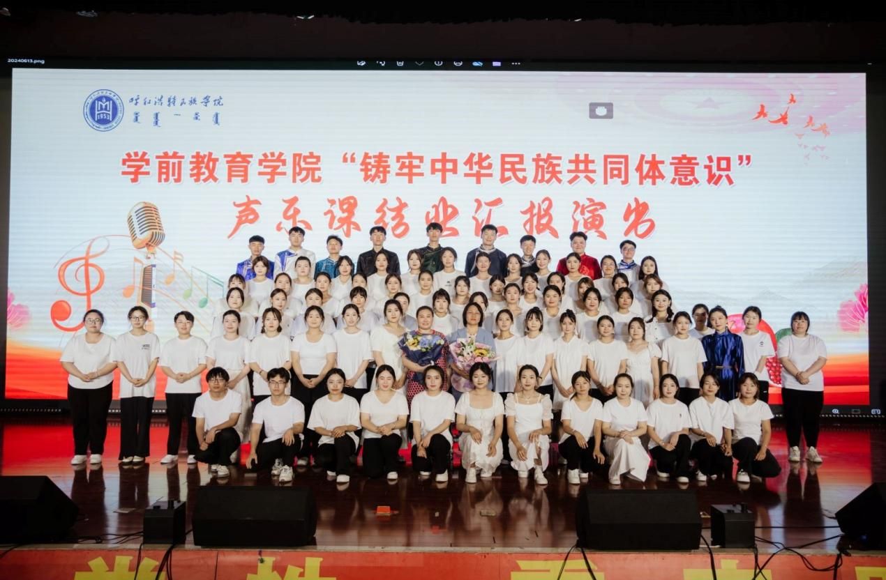 为进一步贯彻落实习近平总书记关于加强和改进民族工作的重要思想,深化我院民族团结进步工作,加强我院师生铸牢中华民族共同体意识教育,学前教育学院2024年6月13日晚19:00时在北图书馆二楼报告厅举办了铸牢中华民族共同体意识主题2021级声乐课结业汇报演出。学前教育学院副院长其其格、新城区第一幼儿园园长计爽,呼和浩特蒙古族第二幼儿园园长乌日勒格以及各二级学院师生共500余人一同观演。本次活动由学前教育学院主办,任课教师萨日胡、梁秀梅老师组织演出。