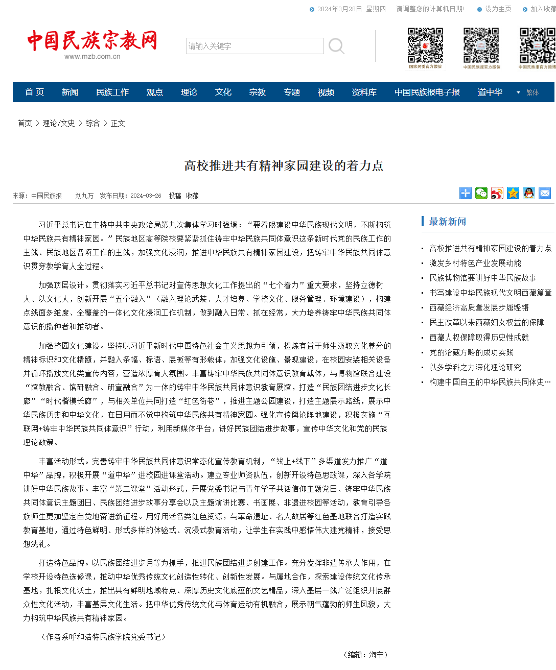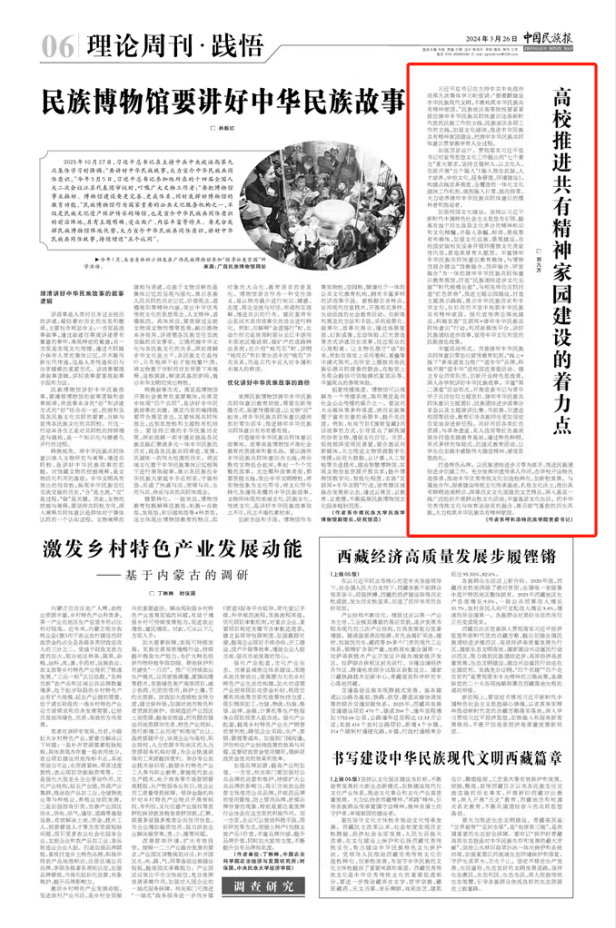 3月26日,《中国民族报》刊发beat365官网党委书记刘九万署名文章:高校推进共有精神家园建设的着力点,中国民族宗教网全文转载。全文如下: