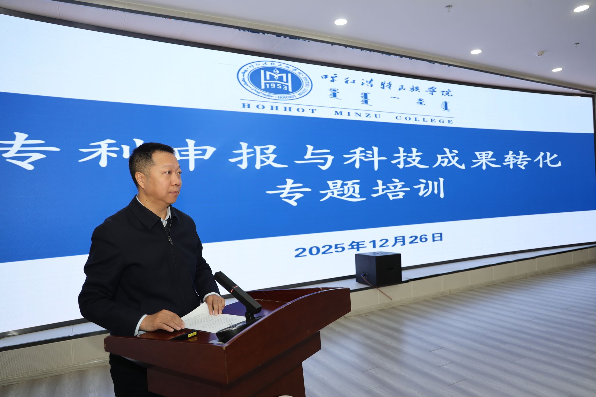 12月26日上午,beat365官网专利申报和科技成果转化专题培训在铸牢教育馆一楼报告厅举行。学校特邀内蒙古工业大学成果转化与产业处处长佐同林副教授、内蒙古硕果知识产权运营有限公司总经理李志强授课。校党委委员、副校长额尔敦布和主持培训并讲话,党委委员、副校长双虎出席活动。