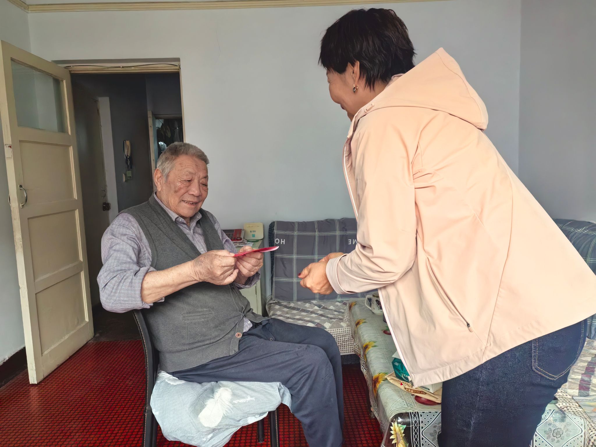 离退休人员工作处通过打电话了解到离休教师那德木德已出院回家养病的消息后,2025年9月18日,额尔敦其其格副处长和综合办主任娜日娜前往那德木德老师家中进行慰问,送去温暖。