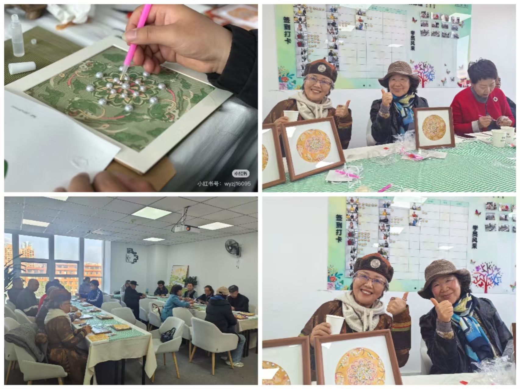 参观结束后,一场趣味十足的珍珠画手工活动拉开帷幕。老同志们围坐桌前,手持胶笔,将圆润的珍珠粘贴在带有传统纹样的底板上——鲜艳的底色搭配精致的花纹,再点缀上洁白的珍珠,一幅幅兼具美感与创意的作品逐渐成型。现场欢声笑语不断,大家在动手创作中既锻炼了手脑协调,也收获了满满的成就感。活动尾声,老同志们手持装裱好的珍珠画合影留念,笑容里满是喜悦。