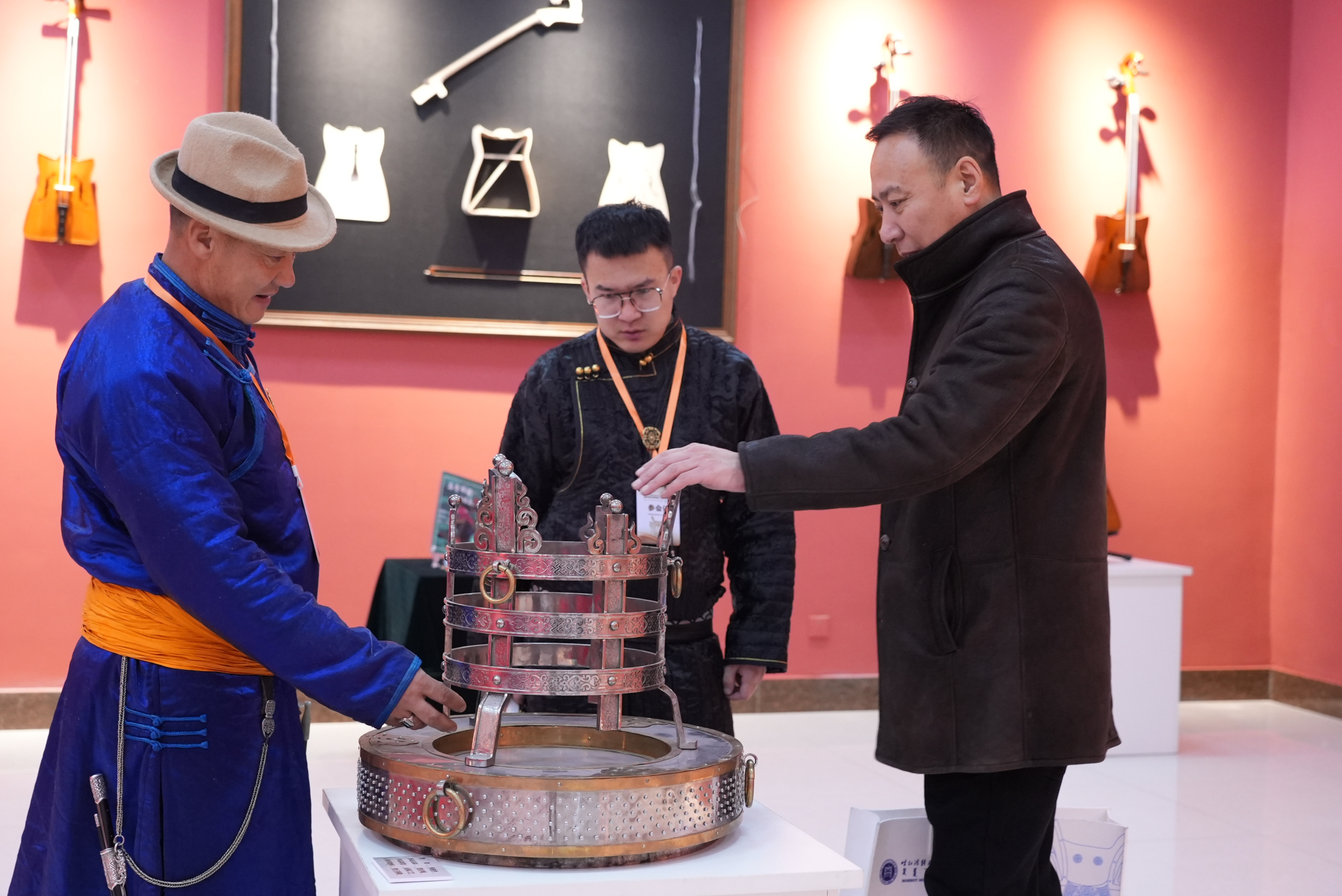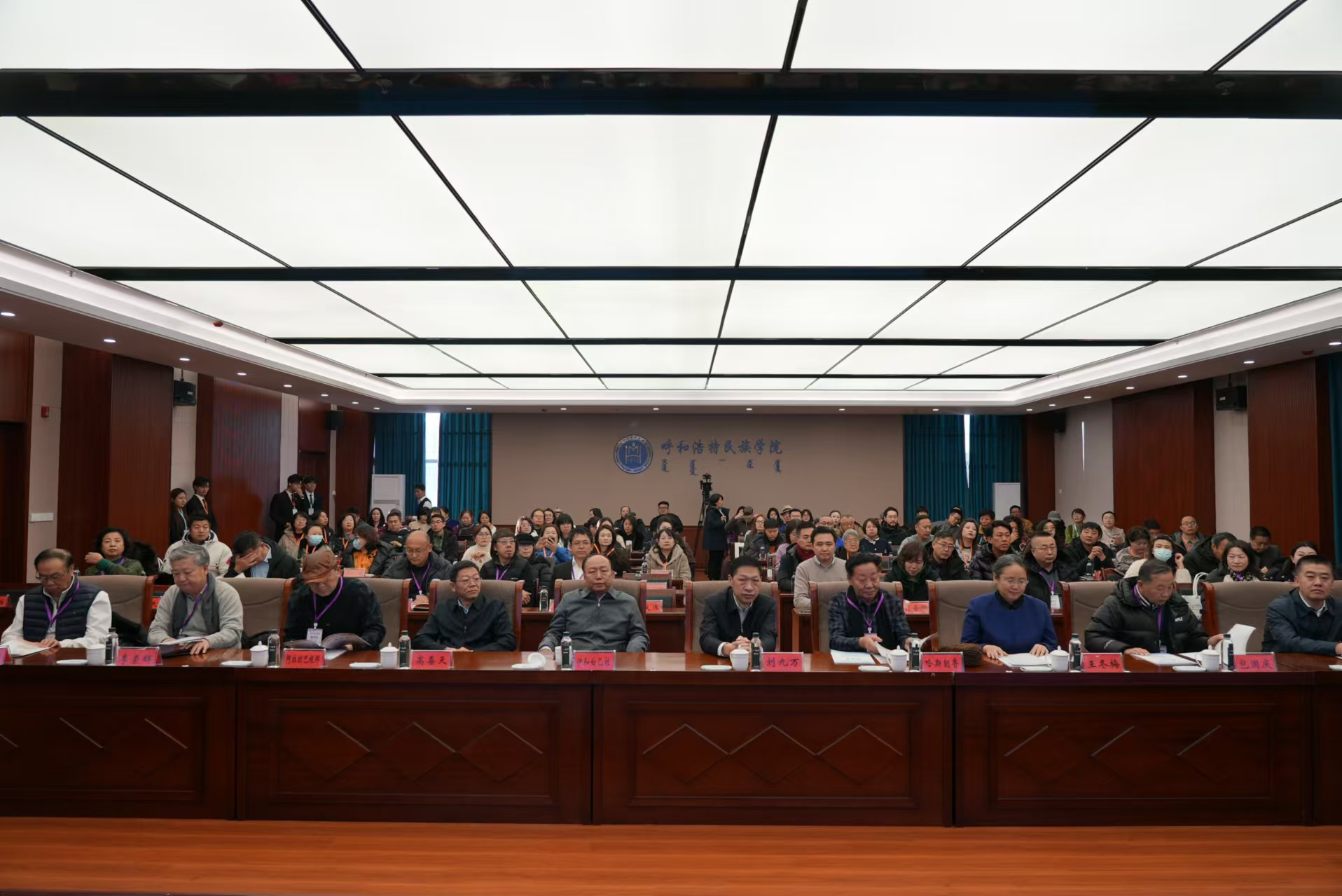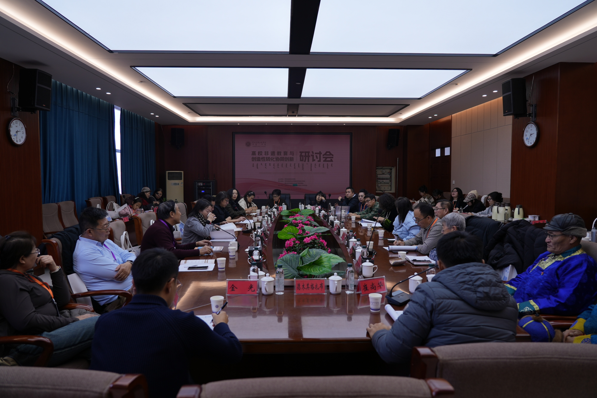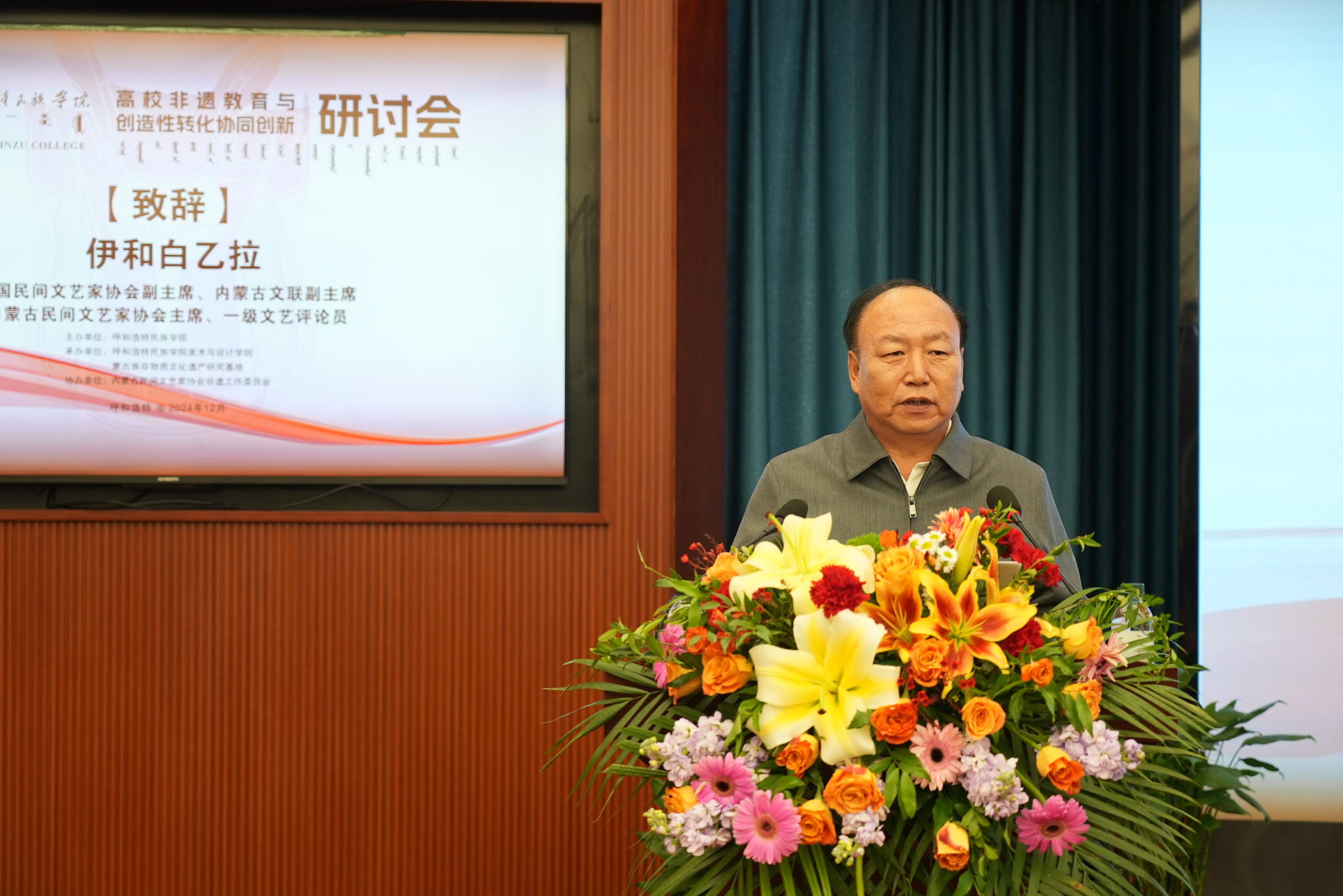 12月21日,由beat365英国官方网站主办,蒙古族非物质文化遗产研究基地和美术与设计学院联合承办的全区“高校非遗教育与创造性转化协同创新研讨会”在综合楼12楼会议室举行。校党委书记刘九万,党委委员、纪委书记、监察专员王冬梅,党委委员、副校长高喜天等校领导出席研讨会。中国民间文艺家协会副主席、内蒙古文联副主席伊和白乙拉;中国美术家协会重彩画研究会理事、内蒙古青年文学艺术家协会理事哈斯朝鲁教授;内蒙古自治区民族事务委员会地方语言文字研究应用中心主任阿拉坦巴根那;中国工艺美术协会副会长,内蒙古自治区工艺美术协会会长包国庆;内蒙古民协副主席、内蒙古师范大学教授李崇辉;亚太工艺美术大师、国家级工艺美术大师、国家级蒙镶工艺及金银细工领头人潘德月等领导与专家学者应邀出席研讨会。来自全区多所兄弟院校及各行各业的专家学者和省市级非遗传承人、工艺美术大师等150余人参加本次学术研讨会。美术与设计学院党总支书记吴利春主持研讨会开幕式,美术与设计学院副院长塔娜主持主旨发言环节。