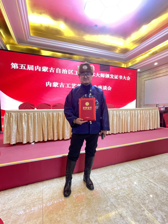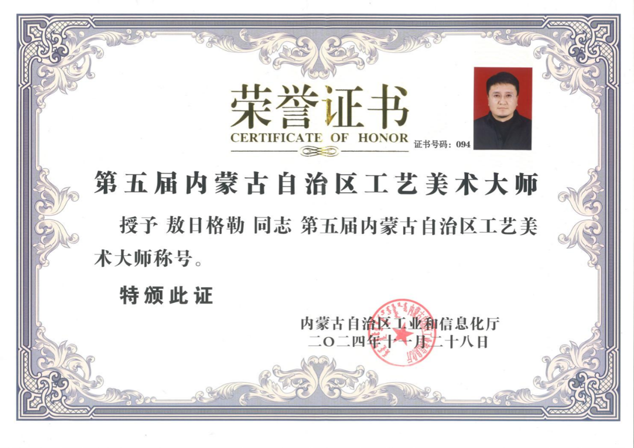 敖日格勒:中国民间文艺家协会会员。内蒙古民间文艺家协会理事。内蒙古工艺美术协会理事。自治区工艺美术大师、在读博士、非物质文化传承人。其作品曾获得全国银奖一次、铜奖一次,自治区级金奖4次、银奖4次。2023年获得第十三届萨日纳奖。