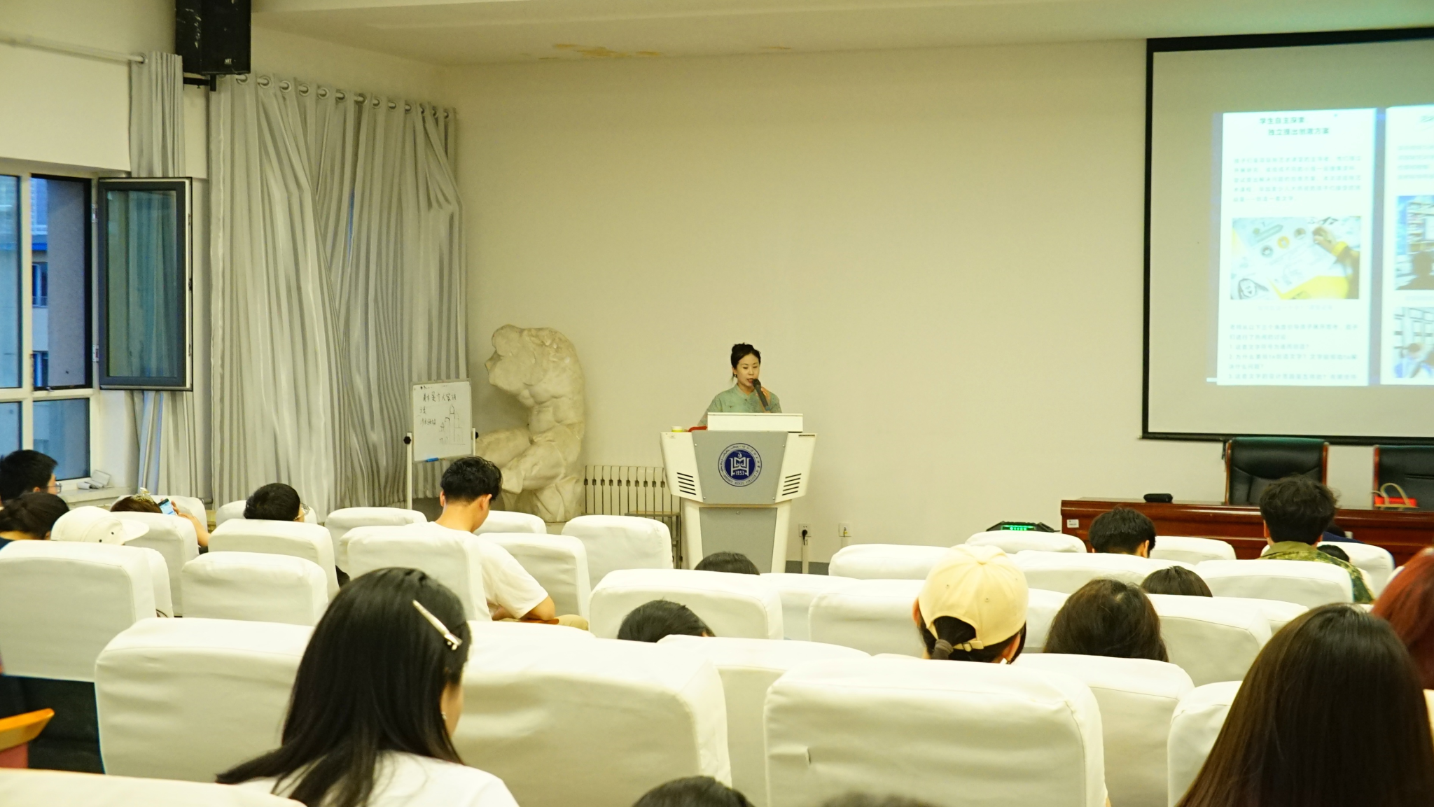 王涛老师以《践行课标理念 落实核心素养提纲》为题目,主要围绕美育与美育教师、2022版《艺术课程标准》研制背景、2022版《艺术课程标准》简析、如何落实核心素养等四个方面,针对美育教育的重要性和2022版艺术课程标准的变化、如何将教材和课标相结合实施中小学课堂教学方面进行了深入详细地解读,并希望同学们在将来的教学工作中能够以核心素养养成为美育教育的核心,做一个合格的美育工作者和传统文化的传播者。