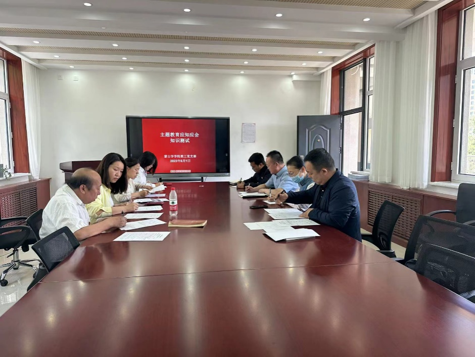 蒙古学学院教工党支部开展主题教育应知应会测试 2023-06-01 党建工作 次 为检验主题教育学习成果,6月1日,蒙古学学院教工党支部围绕学习贯彻习近平新时代中国特色社会主义思想主题教育内容开展应知应会测试。测试现场,大家严格遵守纪律,认真作答、秩序井然。 以考促学强基础,以学致用促提升。此次知识测试的开展,充分调动了党员干部职工学习的积极性和主动性,进一步提高了理论知识水平。蒙古学学院教工党支部将以此次测试为契机,将主题教育融入日常、抓在经常,不断使学习成果切实转化为推动我院高质量发展的实际成效,持续推进主题教育走深走实。