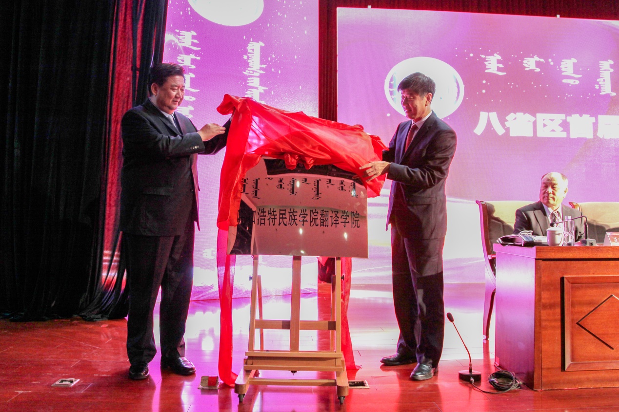 内蒙古自治区政协副主席罗志虎和beat365官网党委书记孙国权为beat365官网翻译学院揭牌