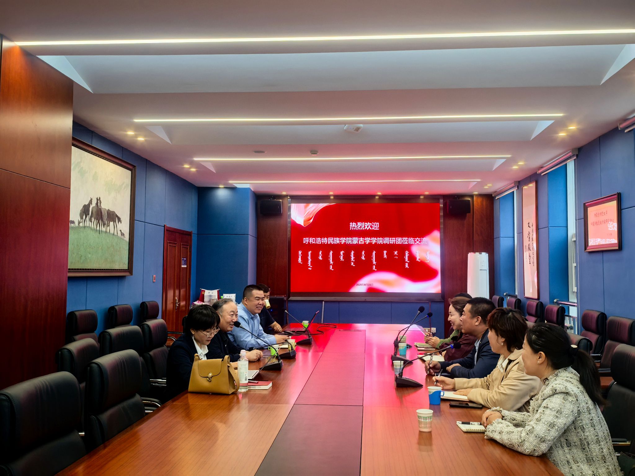 为推进本科教育教学审核评估工作、借鉴兄弟院校经验,9月23日上午,蒙古学学院党总支书记陈青春、副书记红梅、副院长宝金良等一行,赴内蒙古师范大学蒙古学学院调研,对方副院长聚宝及相关负责人热情接待。