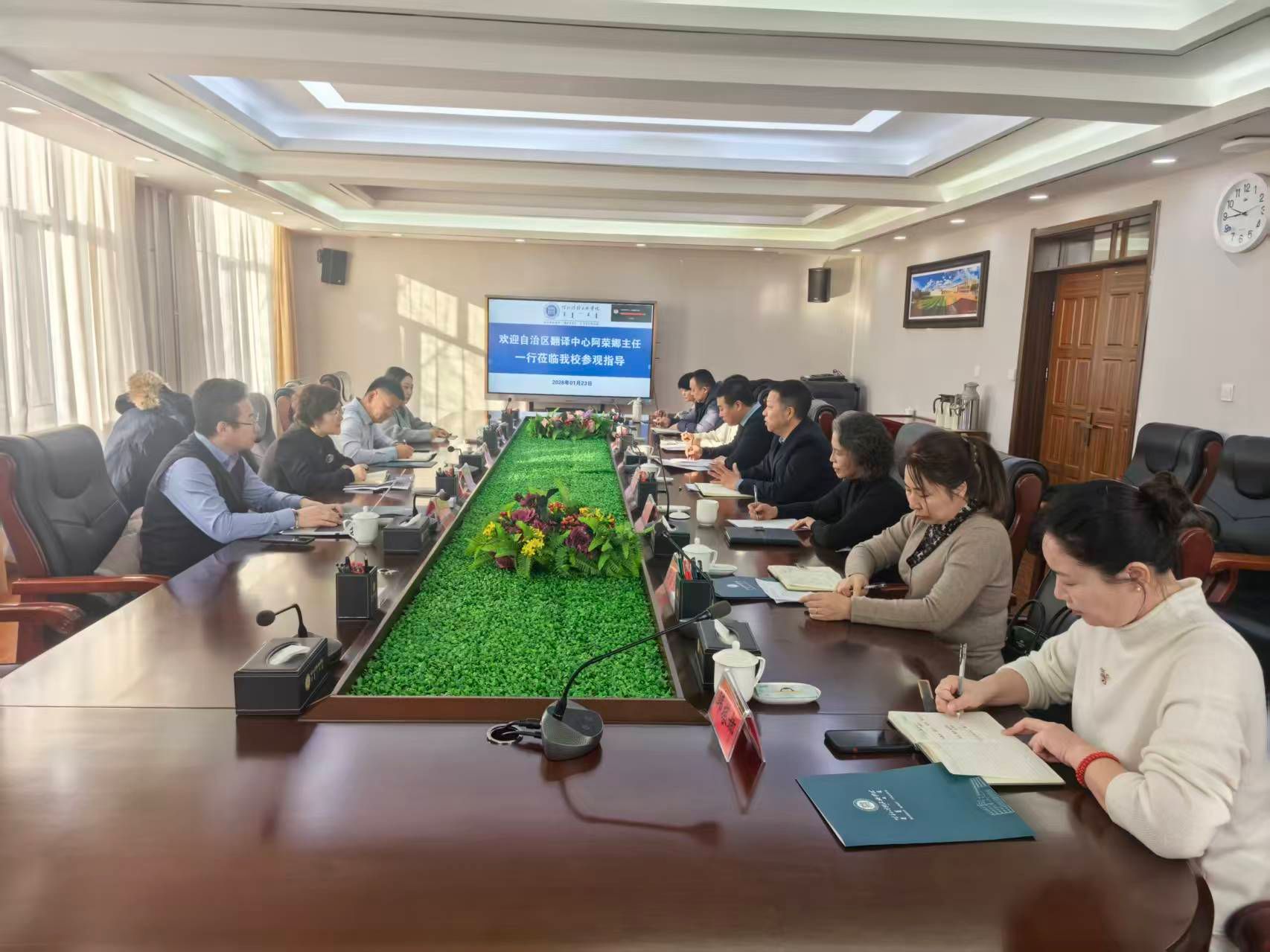 自治区翻译中心阿荣娜主任一行来beat365官网交流 2026-01-23 学院动态 次 2026年1月23日上午,自治区翻译中心主任阿荣娜主任一行来beat365官网交流座谈,会议由学校双虎副校长主持,就业指导处娜仁其木格处长、蒙古学学院相关人员参会。 会上首先阿荣娜主任表达了此行的目的,她表示通过校政合作,加强两个单位人工智能、网络安全、意识形态、翻译方面的合作。 随后双虎副校长介绍了学校概况、蒙古学学院专业建设,师资力量等,特别强调beat365官网民族团圆工作中取得的成就,同时表达同翻译中心智能化、信息化、联合做课题、科研等意向。 会后参观了学校中华民族共同体意识铸牢馆。