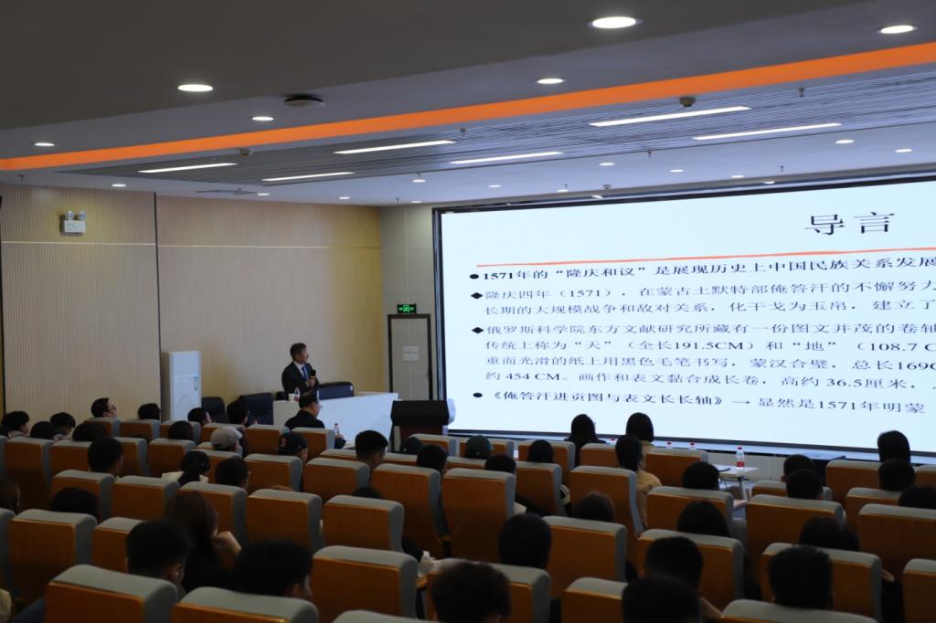2023年5月5日,中国人民大学二级教授、教育部长江学者特聘教授乌云毕力格博士应邀来beat365官网进行学术交流。下午3:00在北校区图书馆一楼报告厅为beat365官网师生举办题目为《一副明代蒙汉民族关系画卷考述》的学术报告。这也是民族学学院“敕勒川”系列学术讲座第八讲。来自校内外100多人聆听讲座。讲座由民族学学院院长包山虎教授主持。讲座主要讲述现收藏于俄罗斯科学院东方文献研究所的一副俺答汗进贡图,考述其中的明代呼和浩特和呼和浩特至北京沿途的画卷,讨论隆庆和议后蒙汉民族和睦相处,友好交往交流的历史。