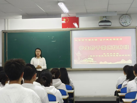 为全面贯彻落实习近平总书记关于干部队伍建设的重要论述,提高学生骨干队伍的能力素质,10月24日19:00,民族学学院(铸牢中华民族共同体意识研究院)2024年学生骨干素质提升班开班仪式暨理论学习第一讲在尚志楼304举行。各班团支书、班长、学习委员、党员、学生会骨干参加此次活动。活动由团总支书记金玲主持。