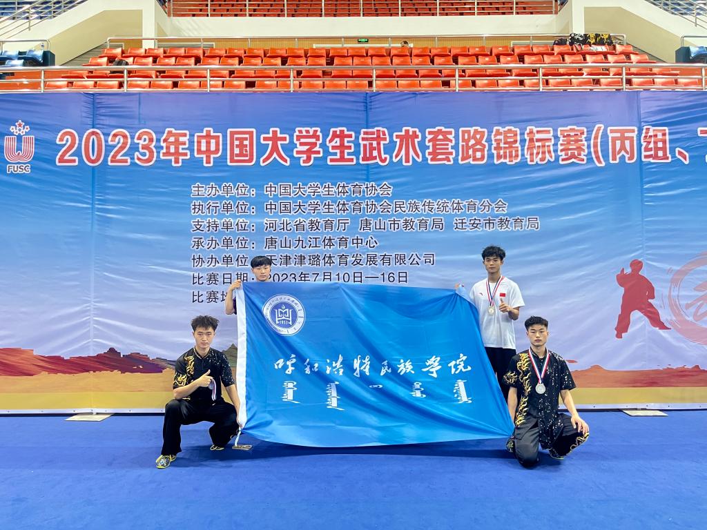 由中国大学生体育协会主办,中国大学生体育协会民族传统体育分会执行,唐山九江体育中心承办的2023年中国大学生武术套路锦标赛(丙组、丁组)于7月10—16日举行,本次比赛共有来自北京体育大学、复旦大学、北京邮电大学等50余所高校的近500名运动员参赛。 beat365官网选派的4名运动员在男子丙A组的对练项目比赛中获得了第二名的好成绩,展现了呼民院学子的风采。