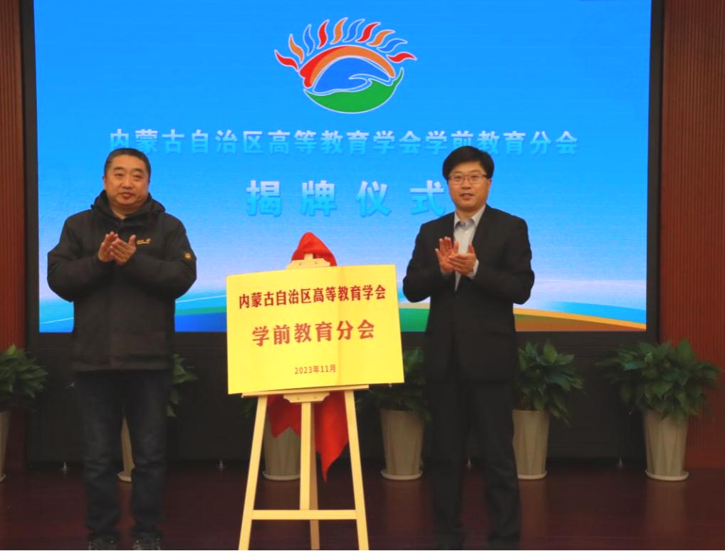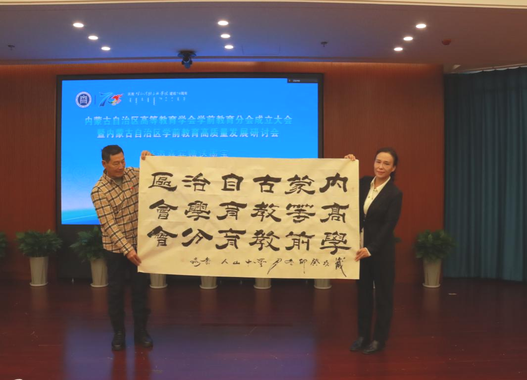 韩伟新和高教学会副秘书长、内蒙古工业大学马克思主义学院党委书记王文华共同为学前教育分会揭牌。中国书画协会副主席彭淼赠送墨宝,学前教育学院党总支书记娜仁其木格接受馈赠。