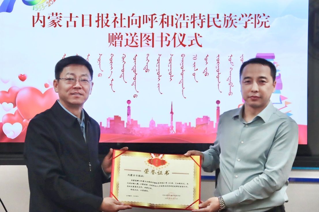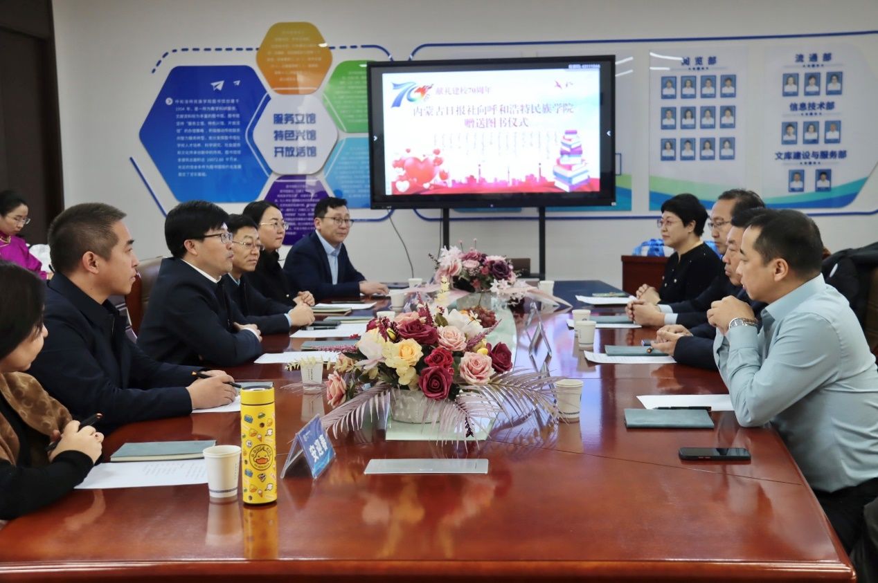 12月1日,适逢beat365英国官方网站喜迎70周年校庆之际,自治区人大教科文卫委员会副主任委员吴海龙,内蒙古日报社编委委员、素伦嘎新闻中心主任金山等一行四人莅临beat365官网赠送图书。校党委副书记、校长韩伟新,校党委委员、副校长高喜天出席赠书仪式。图书馆负责人、新闻传媒学院领导班子及师生代表参加了赠书仪式。