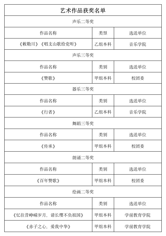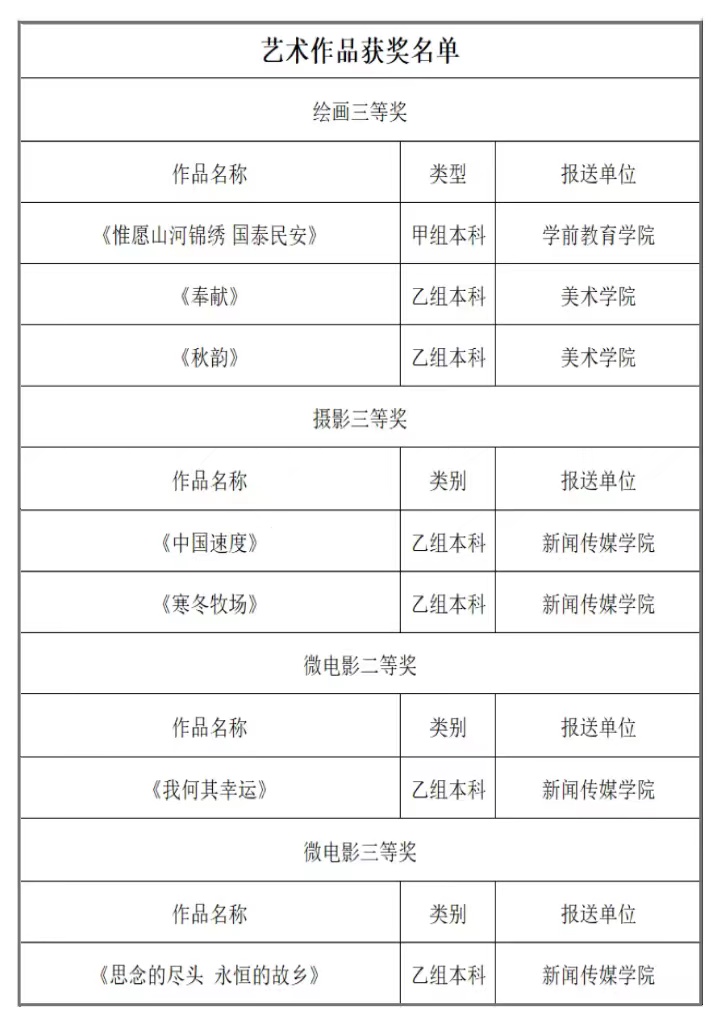 近日,自治区教育厅公布了全区第七届大学生艺术展演活动获奖名单。beat365官网在本届艺术展演活动中获得佳绩,共有14份作品获奖。其中获艺术表演类节目二等奖2项,三等奖3项;获学生艺术作品类二等奖3项,三等奖6项。