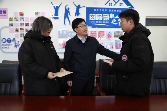 韩伟新代表学校对受灾学生致以亲切问候,并关切询问了学生家庭受灾情况、家人身体状况及受灾后的生活安置情况,为受灾家庭学生送上慰问金,鼓励其以积极乐观的心态正视家庭遇到的困难,安心在校学习,不负青春韶华,继续努力奋斗,将来更好地建设家乡、回馈社会。格根哈斯鼓励受灾家庭学生要勇敢面对困难与挫折,学会在逆境中成长,嘱咐学校相关部门要进一步做好受灾学生帮扶工作,确保受灾情影响学生应助尽助。