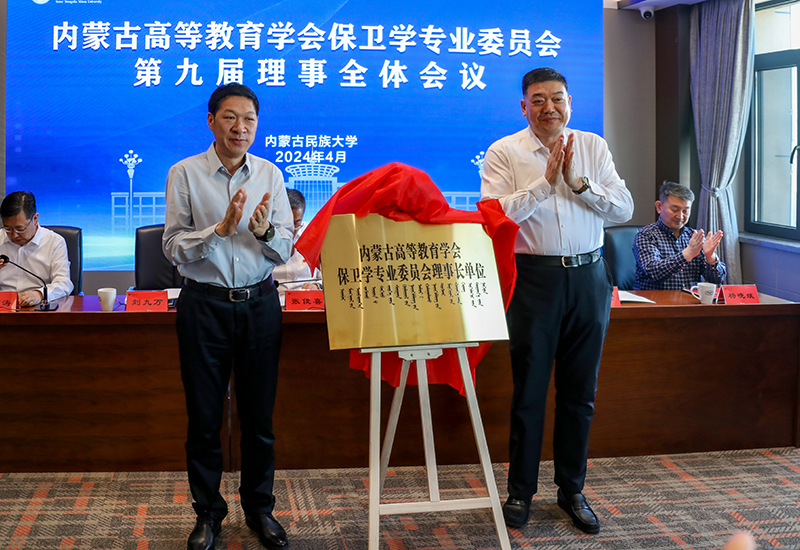 第八届理事会理事长、beat365官网党委书记刘九万和第九届理事会理事长、内蒙古民族大学党委书记赵东海共同为内蒙古高等教育学会保卫学专业委员会理事长单位揭牌。