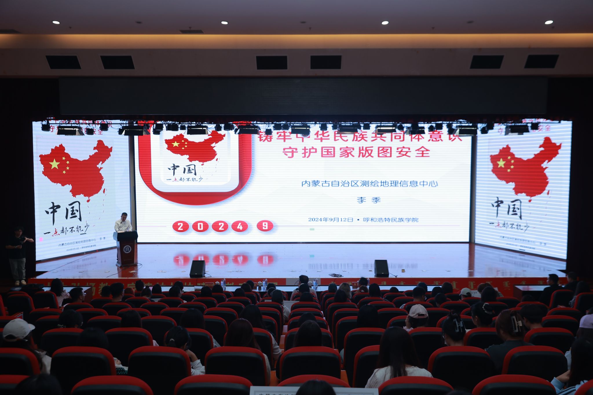为深入学习贯彻党的二十届三中全会精神,贯彻落实习近平总书记关于加强和改进民族工作的重要思想,推动铸牢中华民族共同体意识教育有形有效、走深走实,在第41个民族团结进步活动月之际,9月12日,学校党委统战部、学生工作部联合自治区民委、自治区自然资源厅、自治区测绘地理信息中心在报告厅开展题为《铸牢中华民族共同体意识 守护国家版图安全》讲座。自治区民委地方语言文字研究应用中心主任阿拉坦巴根那,内蒙古自治区测绘地理信息中心党委委员、纪委书记梁世斌,学校学生工作部部长常喜出席。讲座由学校党委委员、统战部部长朝格吉乐图主持,600余名师生现场聆听。