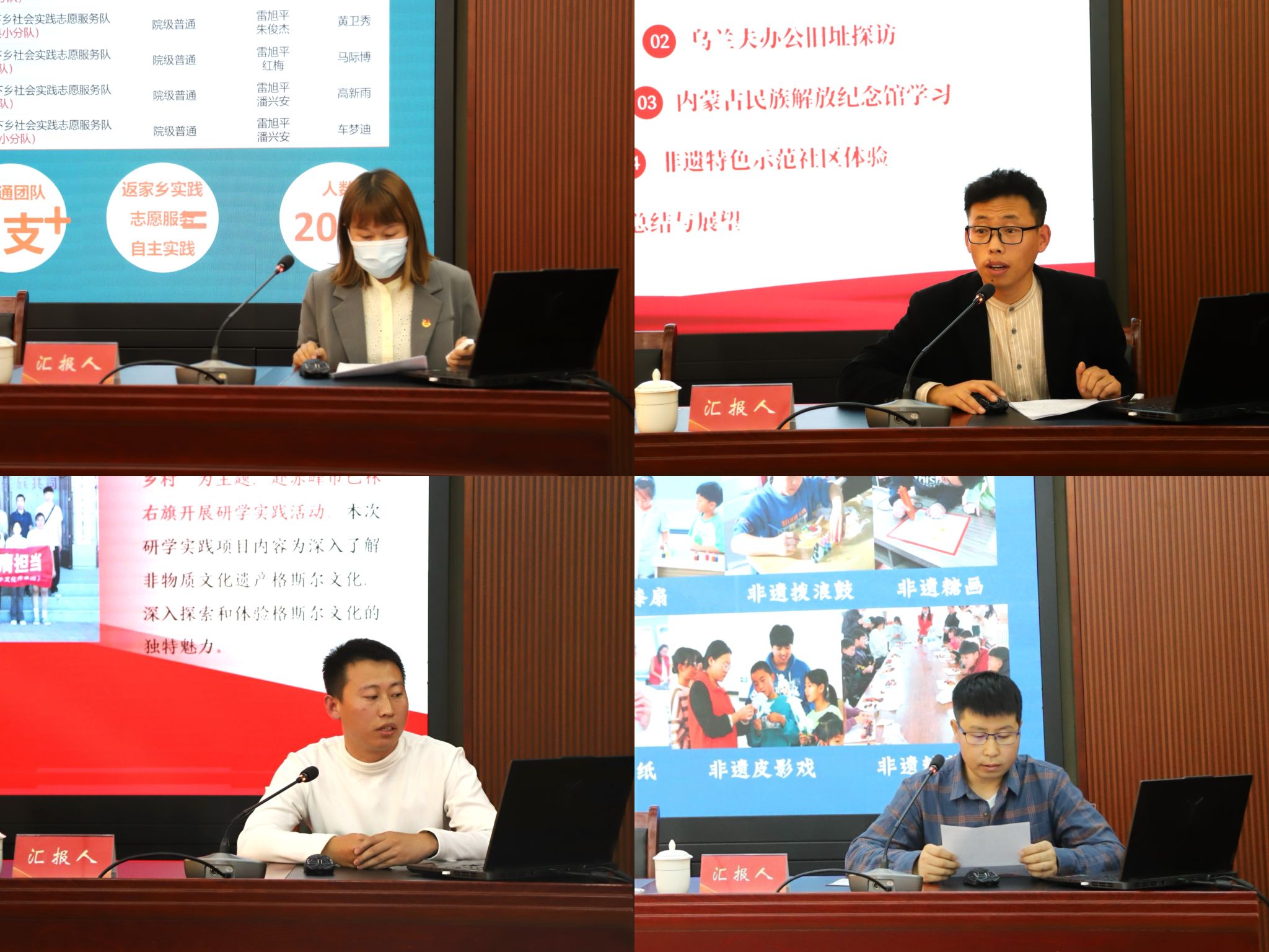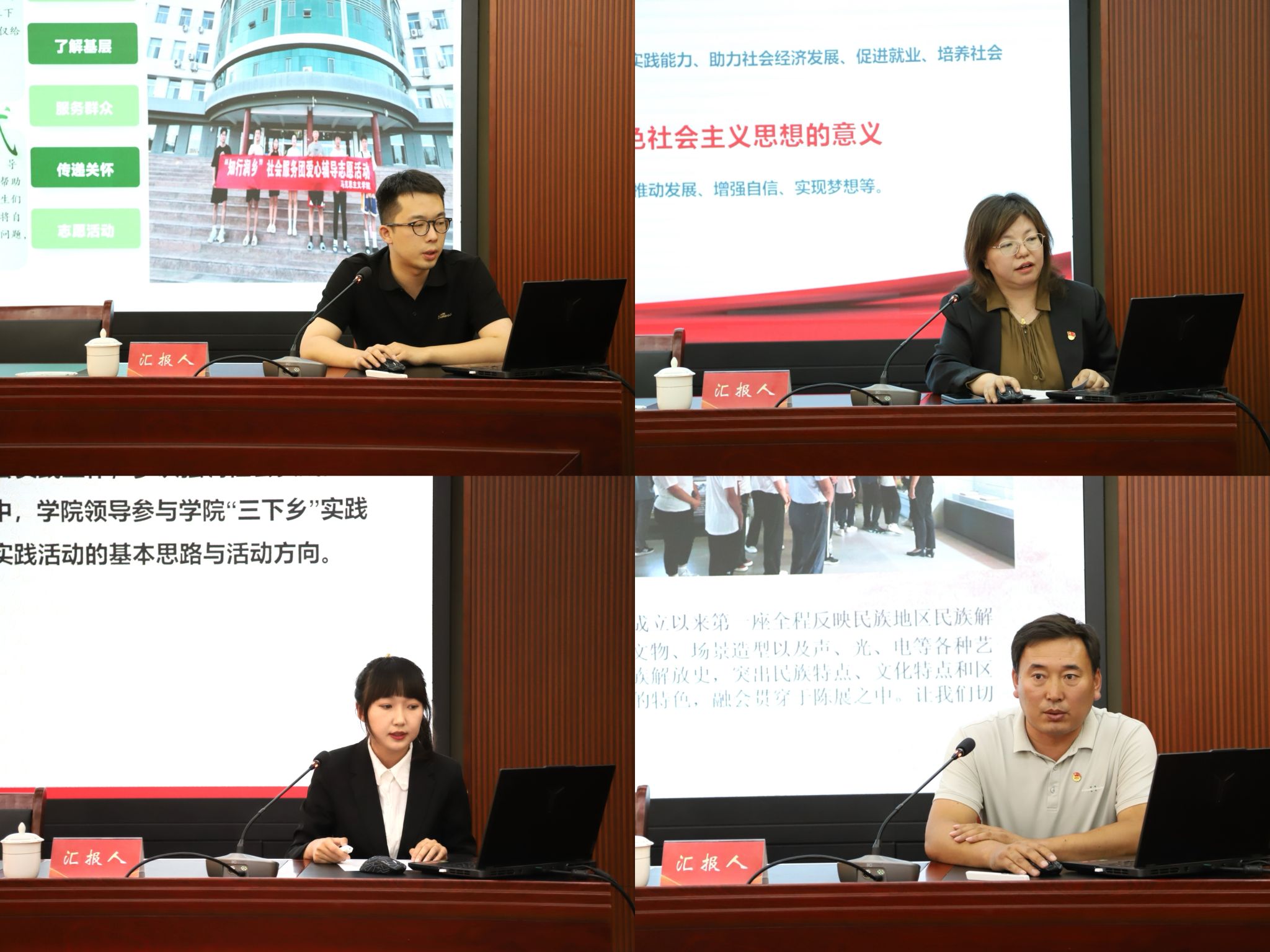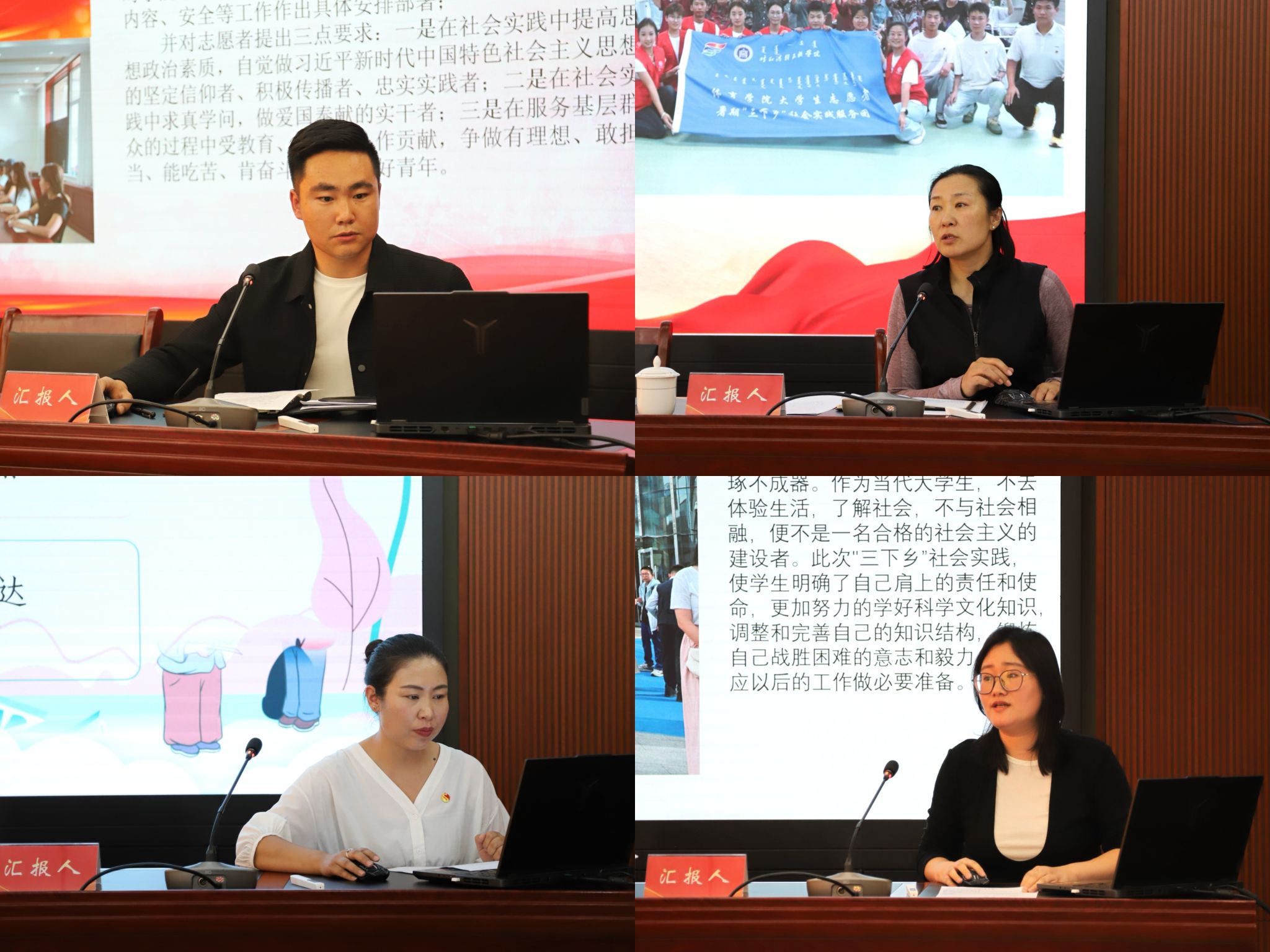 会上,各学院团总支书记、负责人以PPT和视频等形式从组织筹备、活动开展、调研成果、宣传报道等方面依次进行汇报,展示暑期“三下乡”社会实践丰硕成果,分享实践经验和心得。团委副书记胡斯勒对2024年暑期“三下乡”社会实践工作进行了总结。