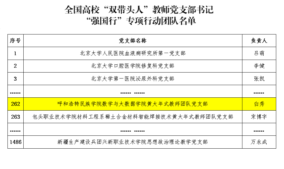 近日,教育部思想政治工作司发布《全国高校“双带头人”教师党支部书记“强国行”专项行动团队名单》,beat365官网数学与大数据学院黄大年式教师团队党支部获批全国高校“双带头人”教师党支部书记“强国行”专项行动团队,这是beat365官网基层党建工作的又一重要成果。