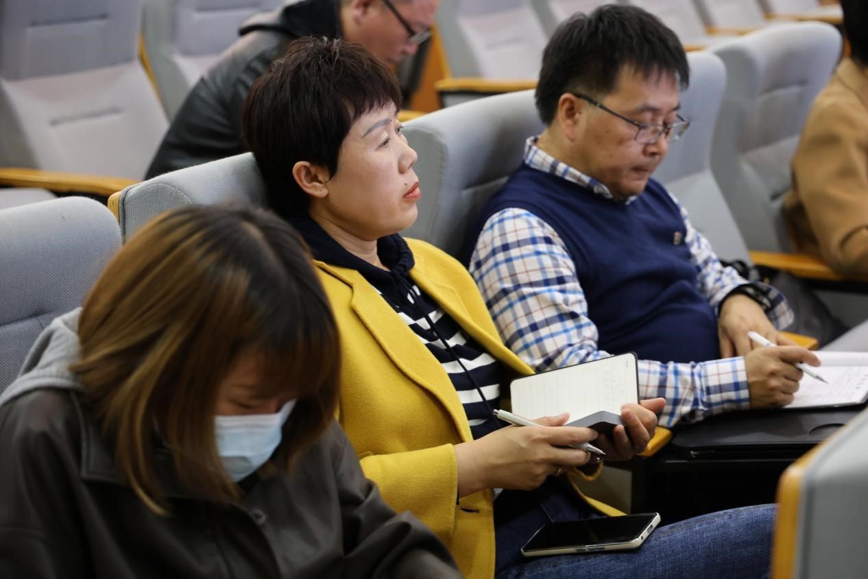 教务处、国有资产管理处、招生就业处、学报编辑部、教学评估与质量监测中心、创新创业中心、师范生技能训练中心、通识教育学院、智能科学学院全体班子成员,留学归国人员联谊会代表,外国语学院和数学与大数据学院党员师生共150人现场聆听。