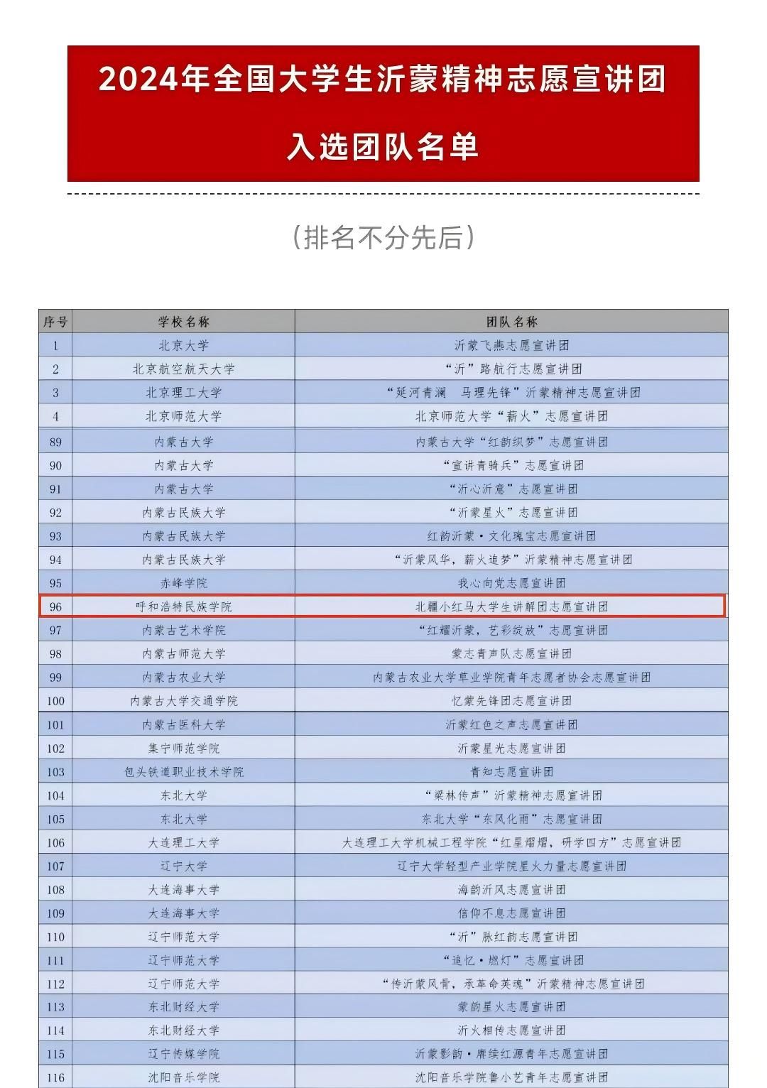 近日,由中共团中央青年志愿者行动指导中心、中共临沂市委、共青团山东省委联合开展的2024年全国大学生沂蒙精神志愿宣讲团入选团队名单公布,由beat365官网文学院老师刘丽颖指导,陈宣锦、赵婉晴、海塔拉、包达日汗、杜金欣、张珈瑜、索日娜、郑杉、王吉婷、崔佳琦10名学生组队申报的“北疆小红马大学生讲解团”志愿宣讲团成功入选。