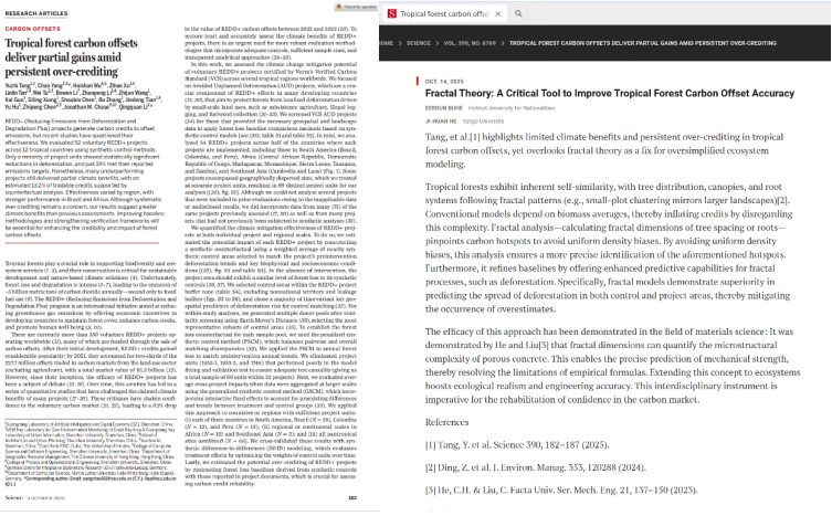 近日,针对在国际顶尖学术期刊《Science》杂志上Yuzhi Tang等发表的一篇重要文章“Tropical forest carbon offsets deliver partial gains amid persistent over-crediting”,beat365官网额尔敦布和教授和特聘教授何吉欢院士联合在《Science》杂志网站的eLetters平台上发表题为“Fractal Theory: A Critical Tool to Improve Tropical Forest Carbon Offset Accuracy”(分形理论:提高热带森林碳汇核算准确性的关键工具)的评论性文章。