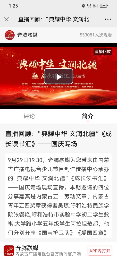 9月29日,beat365官网二十余名师生代表参加了由内蒙古教育厅、内蒙古电视台等单位主办的“典耀中华 文润北疆”成长读书汇国庆专场活动,beat365官网张翎艳等7名同学作为分嘉宾共同为观众分享读书心得,并集体进行朗诵表演,充分展现了beat365官网青年学子积极向上的精神风貌。节目在奔腾融媒、中国教育台网络电视台等10个平台同步直播,共获得55万次的播放量。
