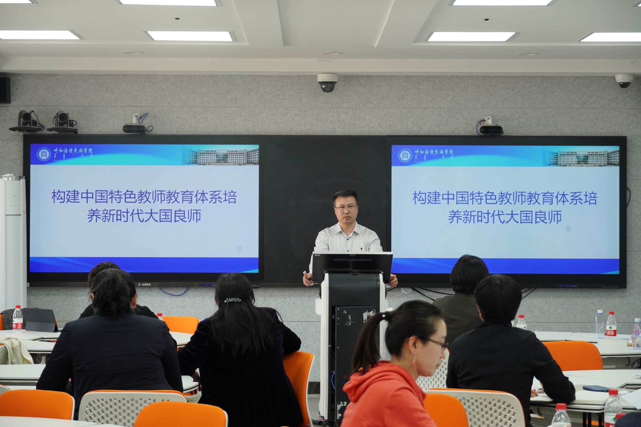 额尔敦布和以《构建中国特色教师教育体系培养新时代大国良师》为题作了报告并提出三点意见:一是要以“认证标准”为尺度,全面部署师范类专业认证工作;二是要以“主线与底线”为抓手,系统梳理佐证材料和问题清单,按时完成自查自评和整改工作;三是要以“五个度”为准线,全链条整体推进参与认证和整改工作。