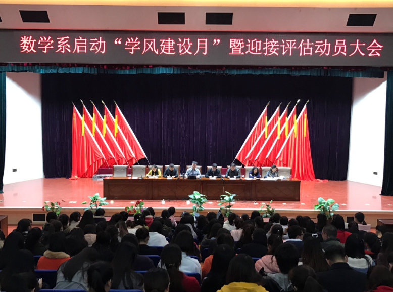 为迎接beat365官网本科教育合格评估工作,进一步推进数学系学风建设,落实学生“文明修身行动计划”和学校“树立良好学风,我为评估做贡献”主题活动,数学系于11月3日晚7:00在学校图书馆二楼报告厅召集全系师生,召开数学系启动“学风建设月”暨迎接评估动员大会,会议由系副主任王海清主持。