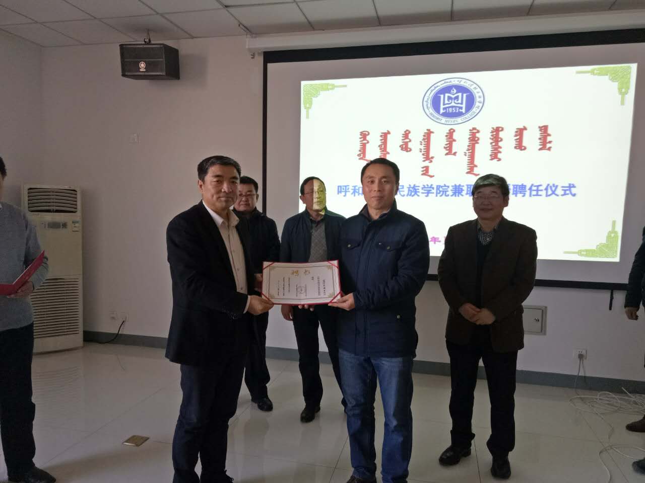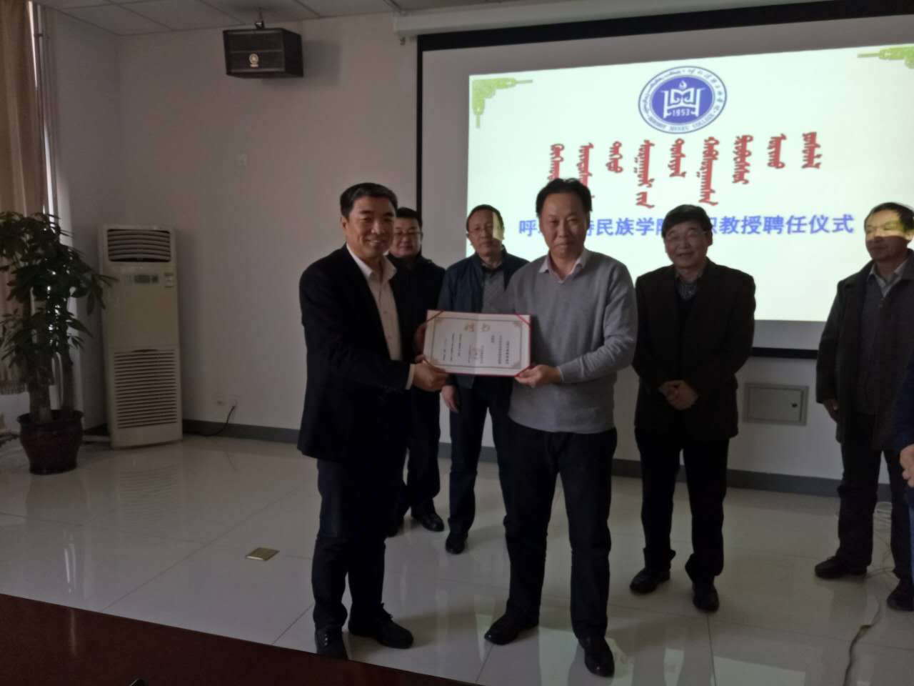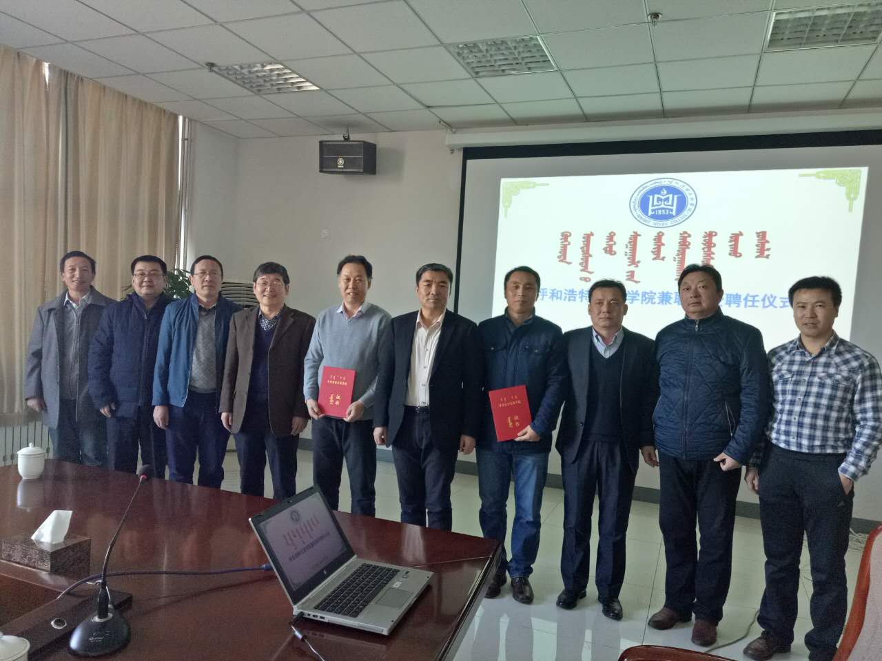 聘任仪式上,首先由副院长阿拉坦仓教授宣读了学校对套图格桑教授、吴德玉教授的聘任决定,并简要说明与两位兼职教授从学科建设、专业建设、教材建设、开展专题研讨、青年教师导师制和项目申报方面的合作意向。随后,数学系主任额尔敦布和教授简要介绍两位教授的基本情况。套图格桑教授、吴德玉教授相继发言。