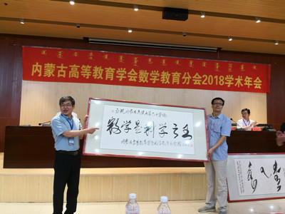 阿拉坦仓教授在致辞中首先感谢国防科技大学朱建民教授、渤海大学张盛教授前来参加年会,感谢内蒙古民族大学承办本次年会,同时对鼎力支持分会发展的内蒙古自治区教育厅、内蒙古高等教育学会、高等教育出版社数学分社、中软国际教育集团和全区各高校数学院系及学界同仁表示感谢。阿拉坦仓教授简要总结分会成立以来开展的活动和取得的成绩,分会先后主办著名数学家张恭庆院士报告会、四届全国高校数学微课程教学设计竞赛内蒙古分赛区比赛、内蒙古高校数学教师微课程培训会、2017年高校数学教学暑期培训暨第三届华北赛区微课竞赛颁奖会等活动;2017年由分会推送的数学微课程作品取得华北赛区特等奖3名、一等奖4名、二等奖10名和全国决赛中荣获二等奖3名的好成绩。最后,阿副院长指出,在“四有教师”指向和“四个回归”理念下,高校数学教师应该以数学教学模式与教学方法的创新为突破口,在课堂教学实践中凝练出自己独特的教学理念和思想,全面推动课堂教学能力与教学科学研究的发展。阿拉坦仓教授致辞后代表分会向内蒙古民族大学及内蒙古民族大学数学科学学院分别赠送书法作品,祝贺内蒙古民族大学建校六十华诞。
