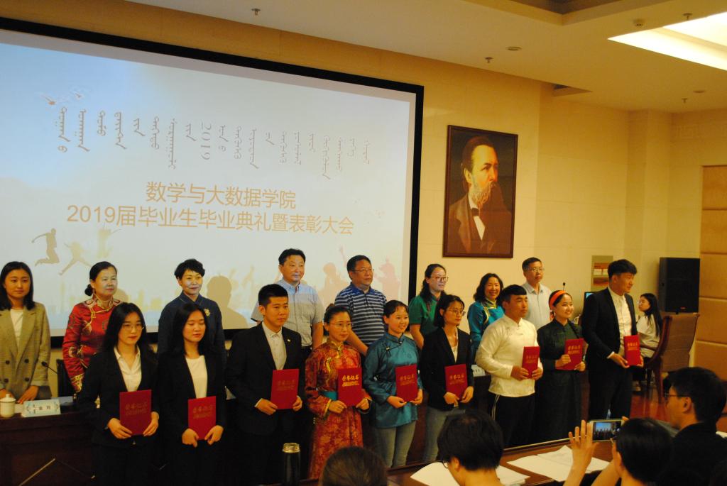 2019年6月12日19:00,数学与大数据学院2019毕业生毕业典礼暨表彰大会在图书馆一楼报告厅举行。数学与大数据学院党总支书记布和朝鲁、党总支副书记郝喜凤、主持工作副院长王海清、副院长额尔敦其其格、办公室主任乌云其其格、小学数学教育教研室主任其木格、经济数学教研室主任白秀及班主任、任课老师、学生代表参加了本次大会。会议由辅导员金玲主持。