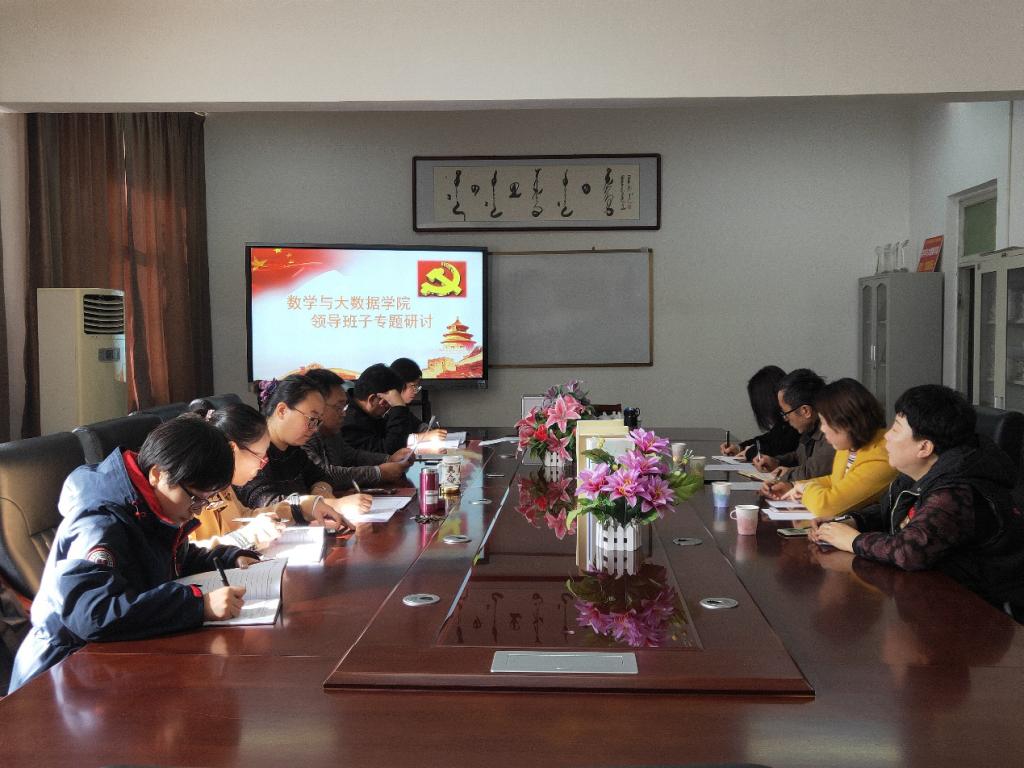 10月24日上午,数学与大数据学院在沃德楼205会议室(主题教育读书室)召开班子成员对照党章党规找差距专题会议,学校主题教育第三指导组海泉组长一行到会指导。学院领导班子成员在前期逐条认真学习的基础上,对照党章党规,重点对照党章、《关于新形势下党内政治生活的若干准则》《中国共产党纪律处分条例》查摆问题,并结合个人、职责、工作实际谈学习认识、谈短板不足、谈问题原因、谈整改举措。